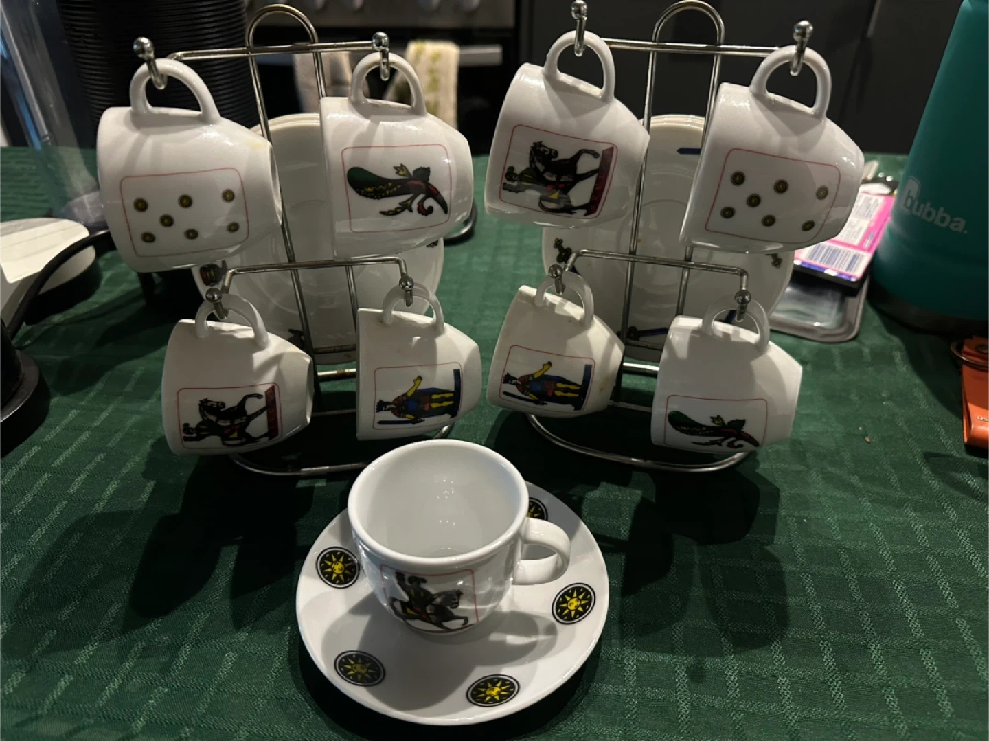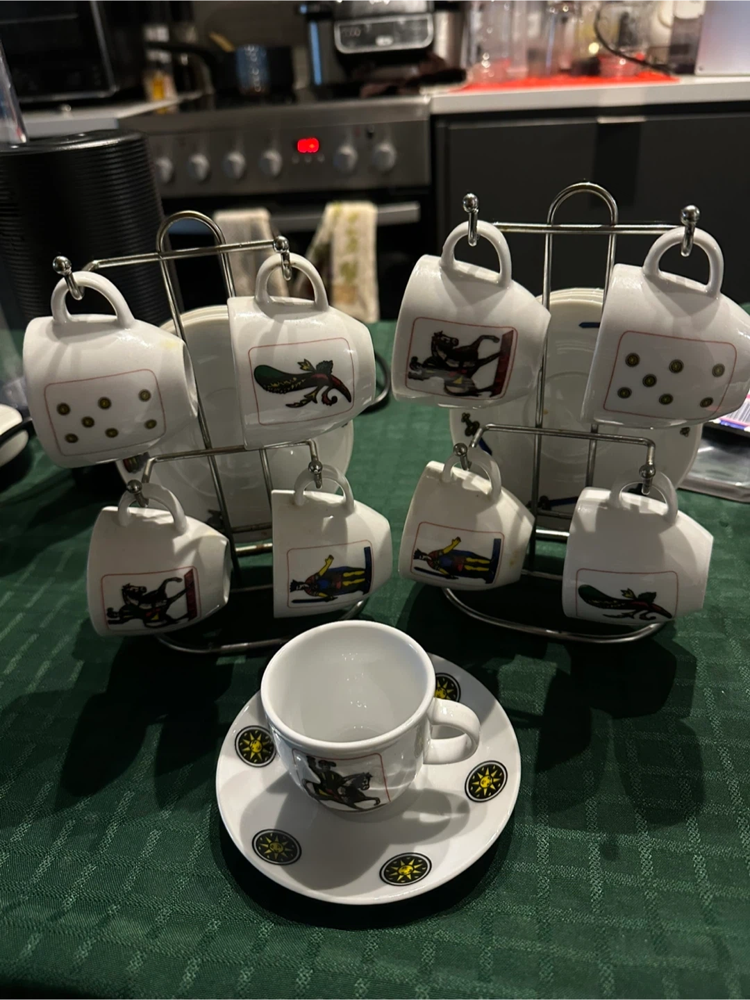 Italian cards espresso cup and saucer set with a stand! It includes 8 cups and 8 saucers, perfect for having friends over for coffee. The cups and saucers have a unique design, and the stand makes it easy to store and display them