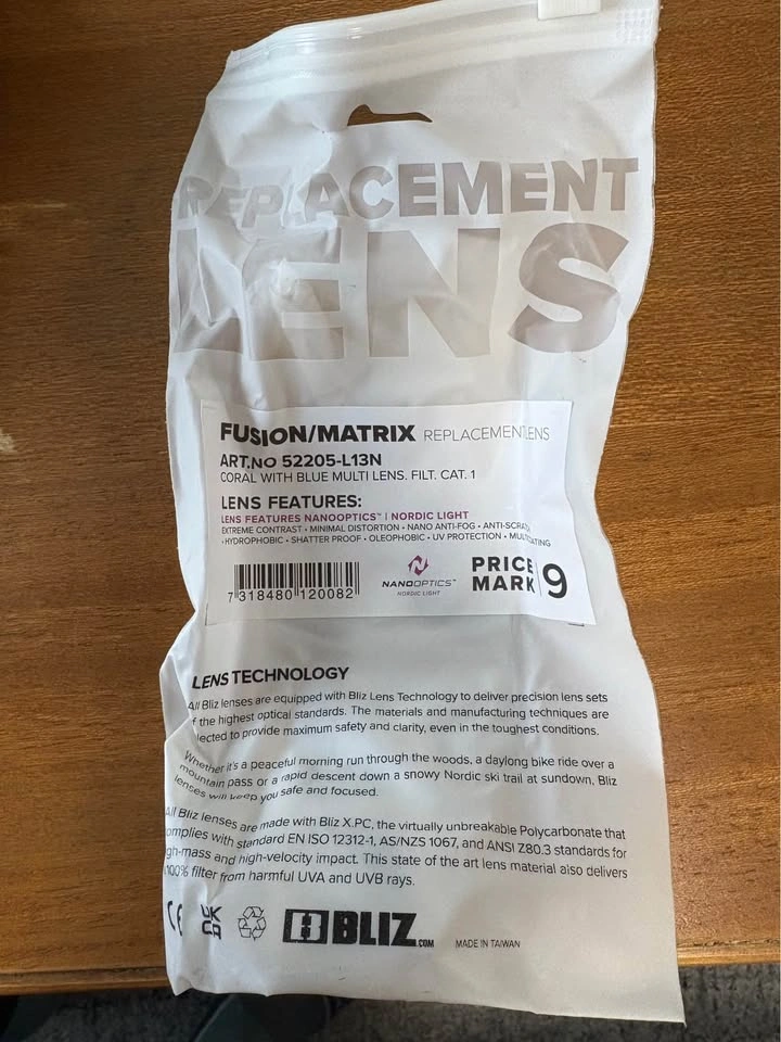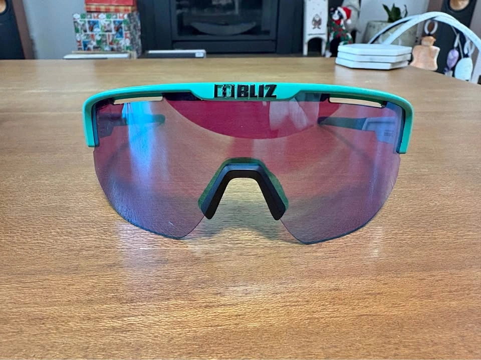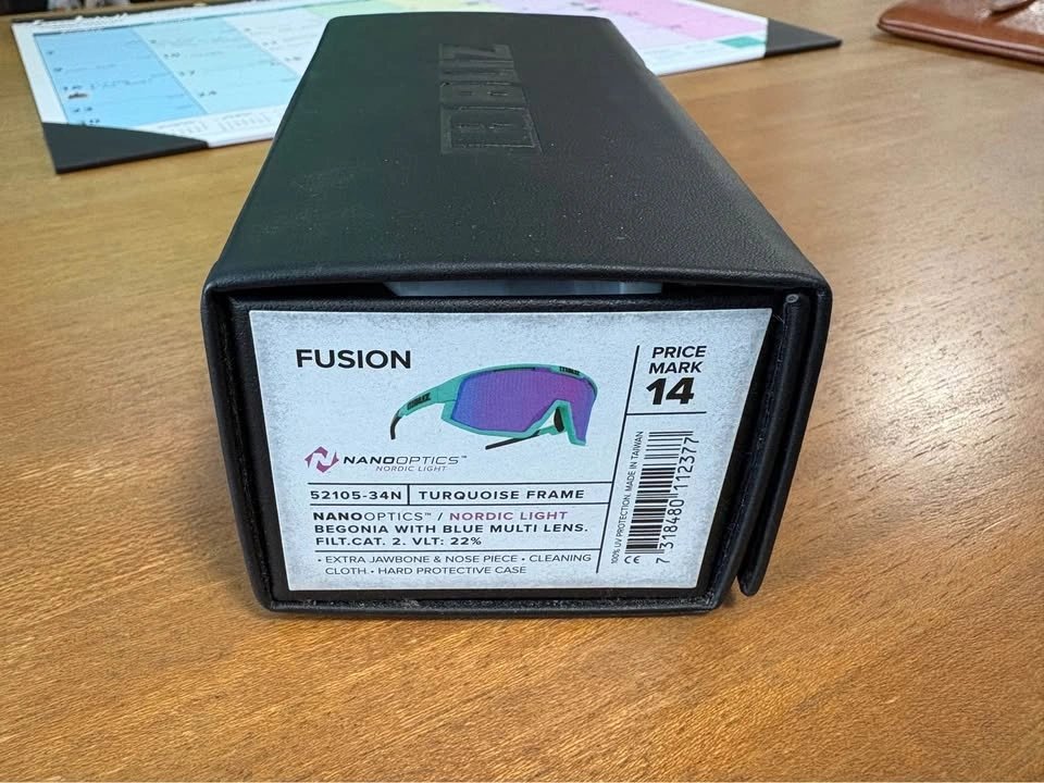 Selling a pair of Bliz Fusion sunglasses in turquoise. They have two optional bottom frames in either turquoise or black, and 3 lens replacements. One replacement lens is brand new and in the original packaging. All lenses feature anti-fog, anti-scratch, and hydrophobic technology.