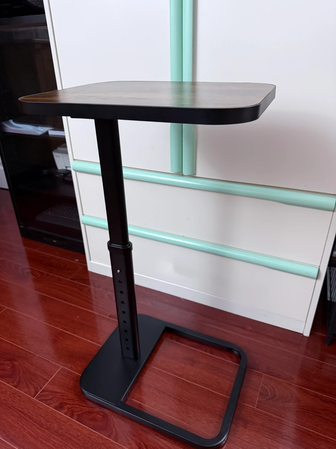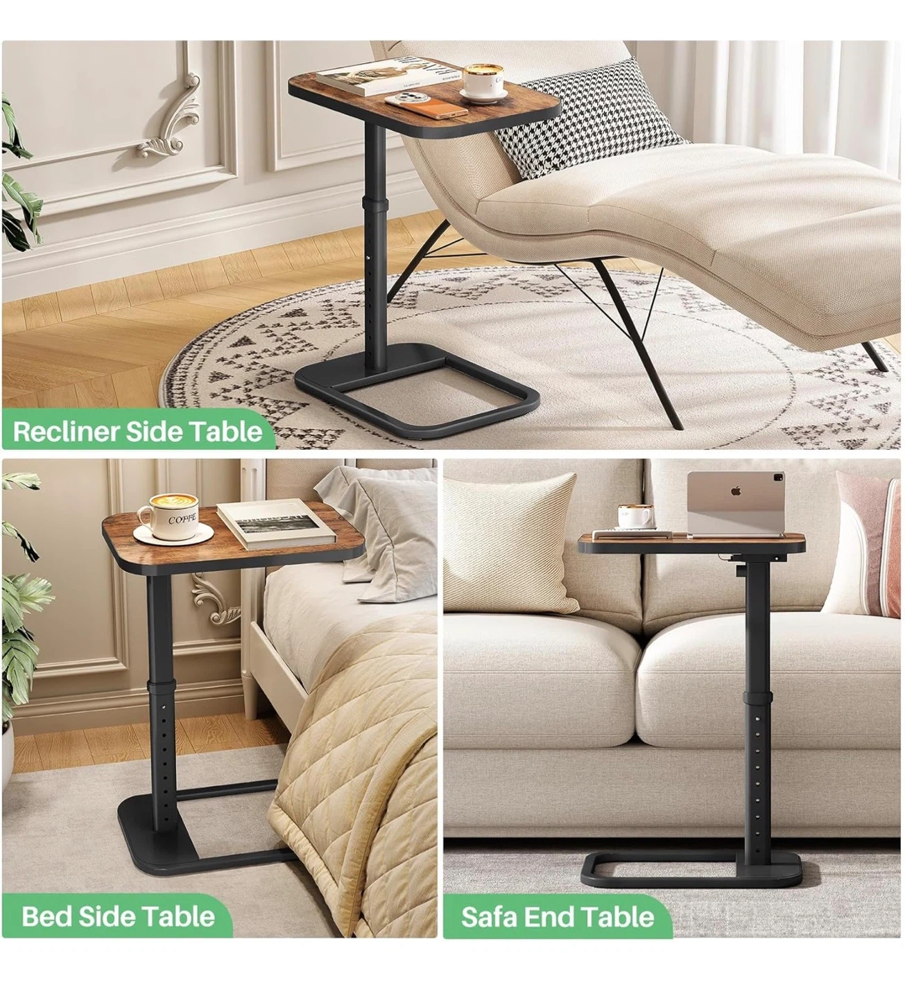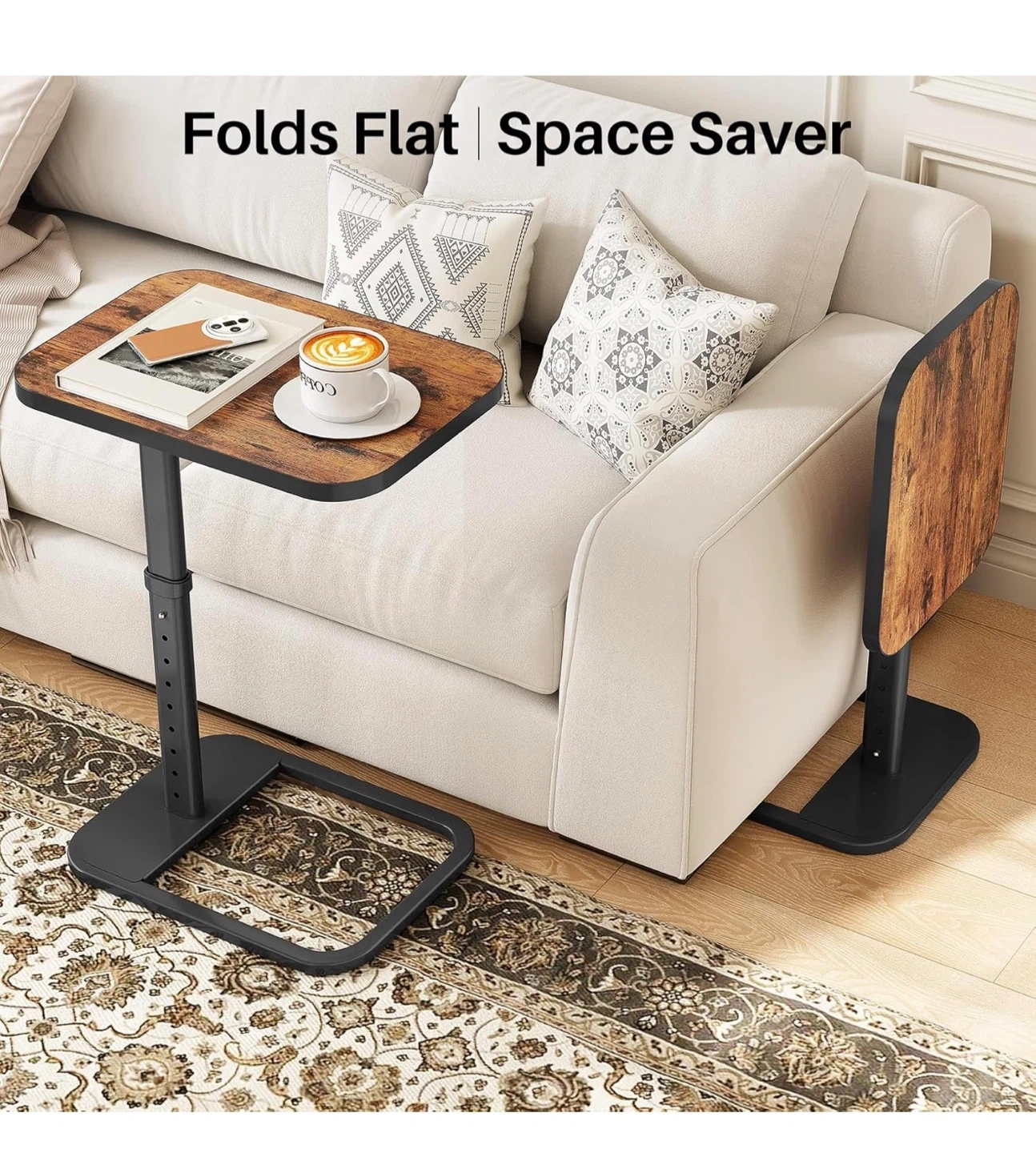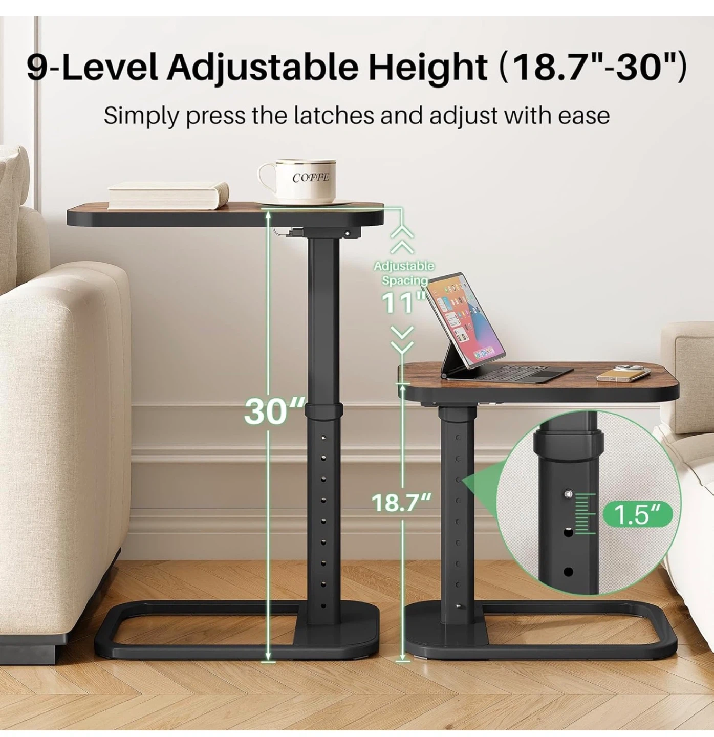 This side table has a wood-look top and a black metal base. It's adjustable in height from 18.7" to 30". The tabletop measures 16.1" by 12.2". Use it for your laptop or as a convenient surface next to your couch!