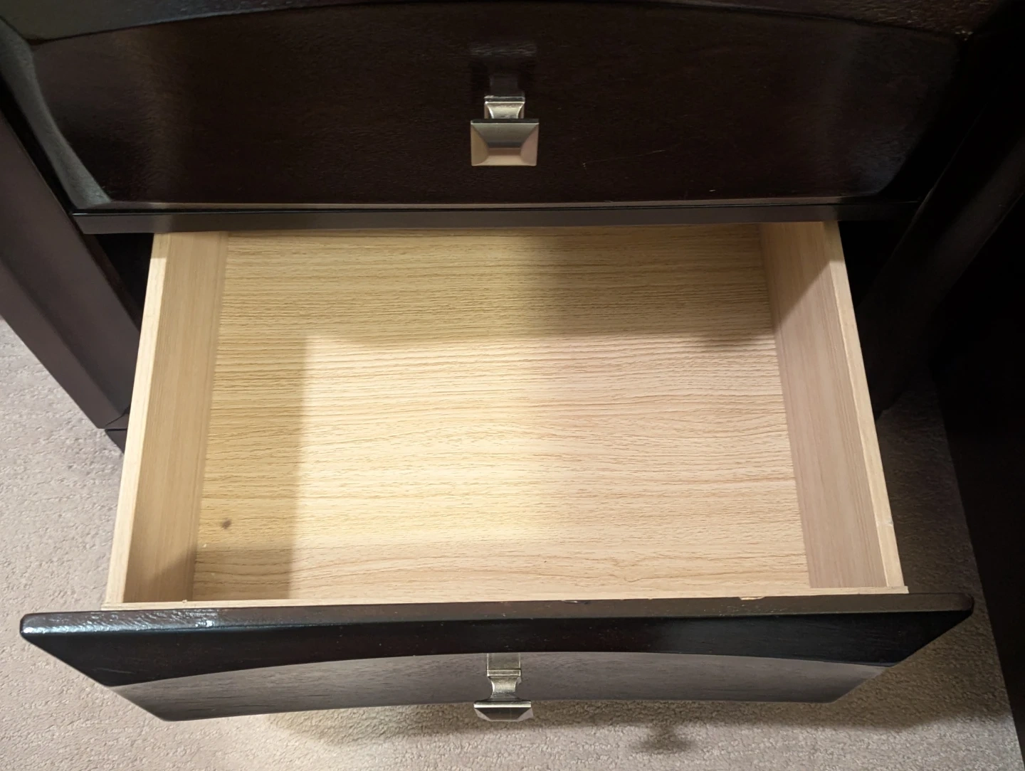 This is a lovely dark wood nightstand with two drawers (there are TWO night stands). It's perfect for keeping your bedside essentials close at hand. The drawers slide smoothly, and the overall condition is great. It would look great in any bedroom!