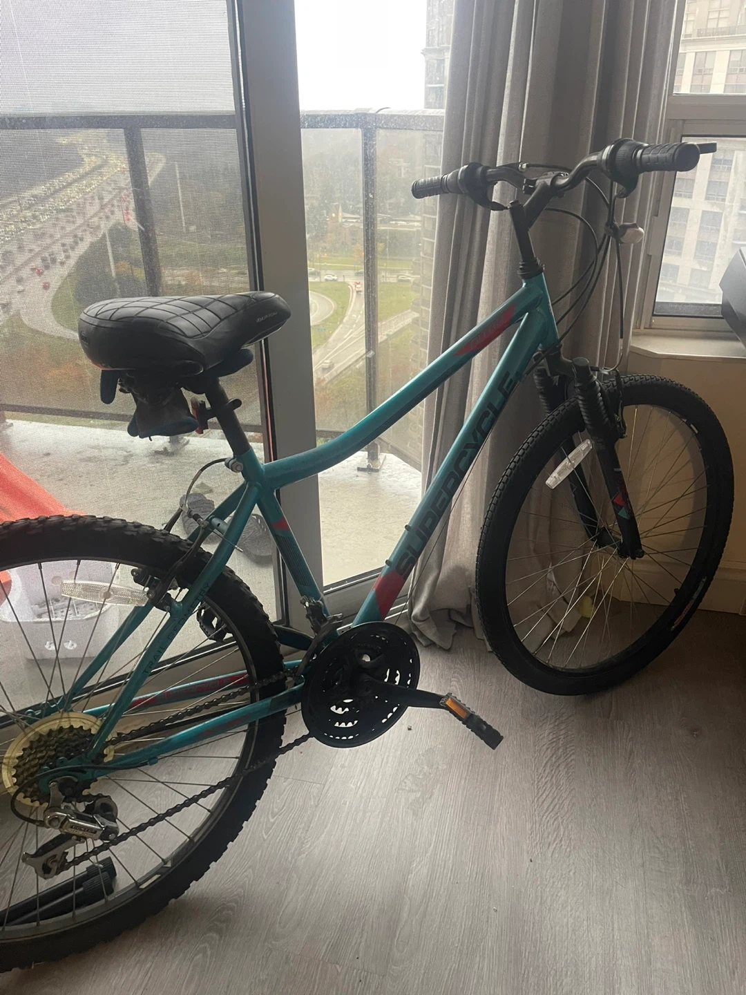 Selling a Supercycle Trail Cruiser bike in teal. It has some signs of wear on the handlebars, but is otherwise in good condition. Great for cruising around the neighbourhood or hitting some trails!