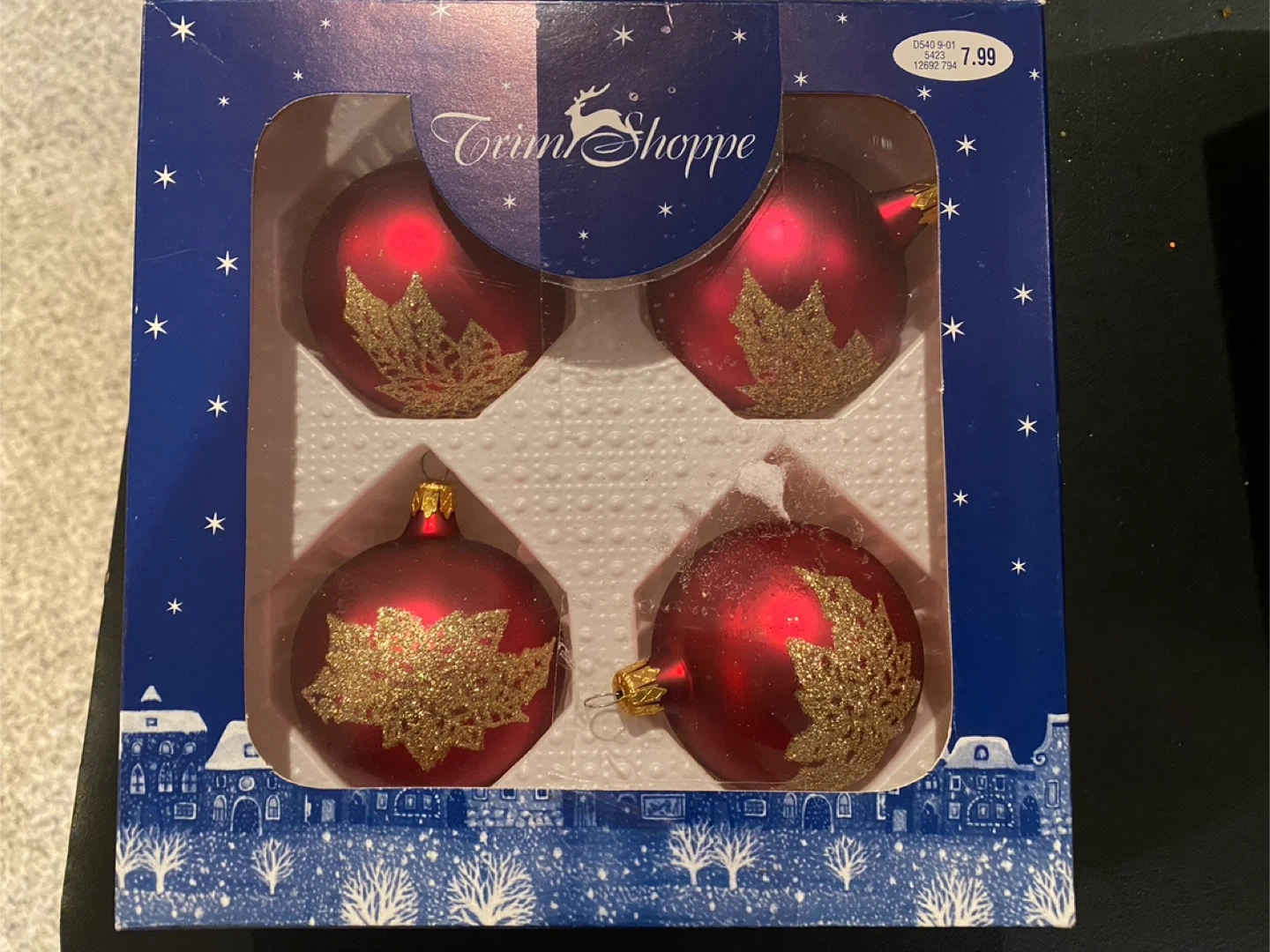 Here's a set of four lovely red and gold Christmas ornaments from Trim Shoppe! They come in their original box, ready to add a touch of festive cheer to your tree this holiday season