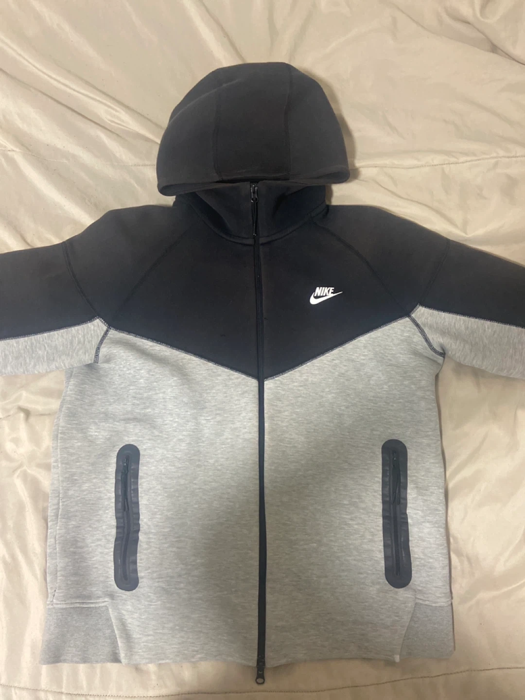 Selling a Nike Tech Fleece hoodie in size large! It's a stylish hoodie with a black and grey colour block design. The body is made of 53% cotton and 47% polyester, making it super comfy and durable!