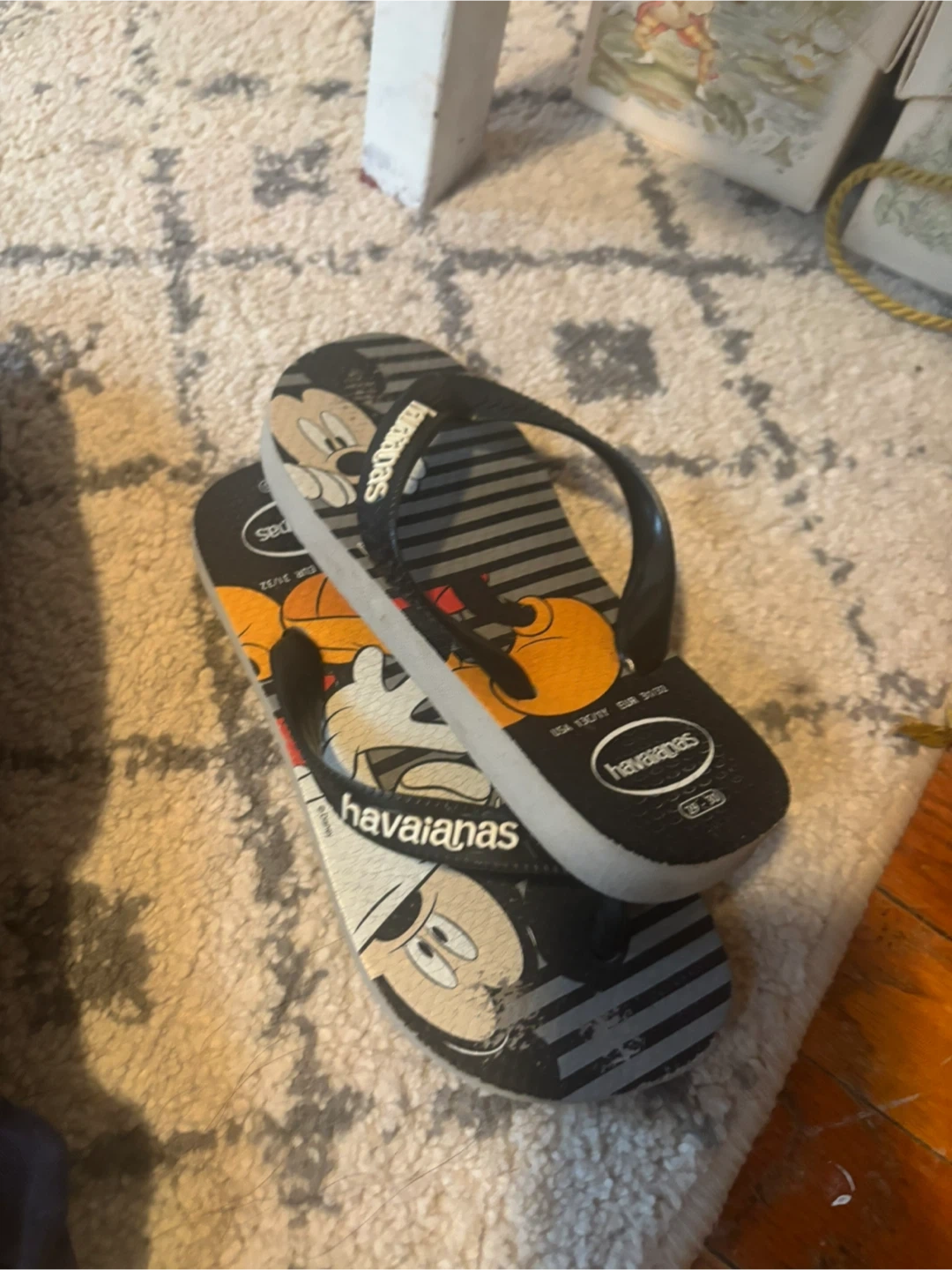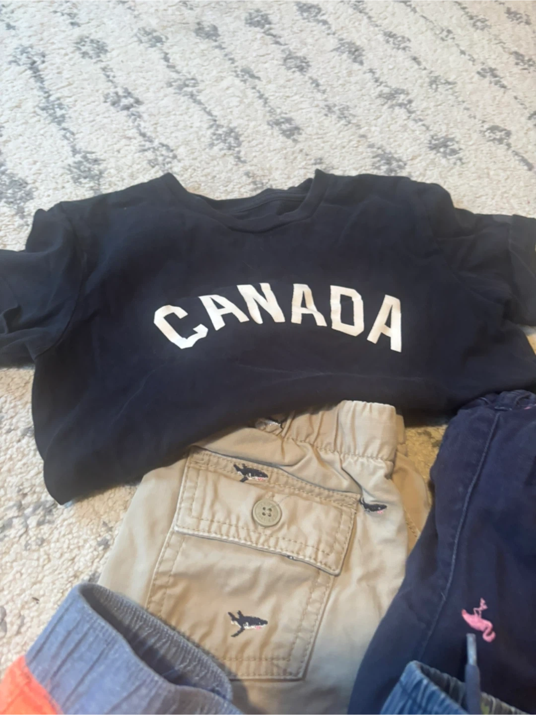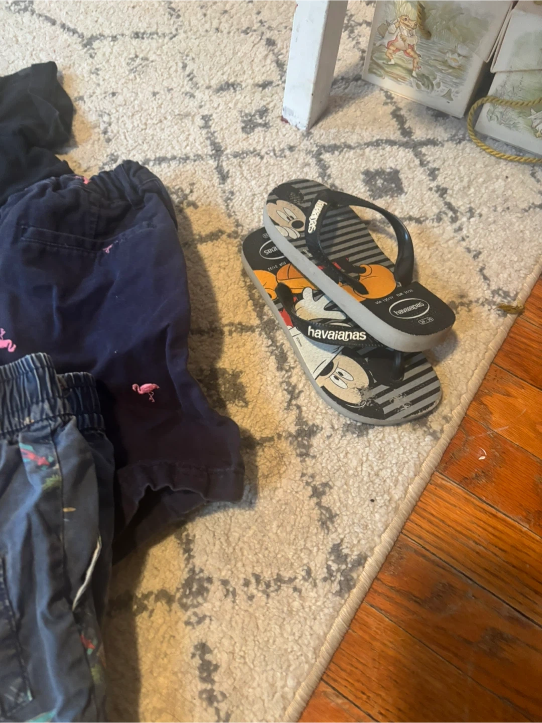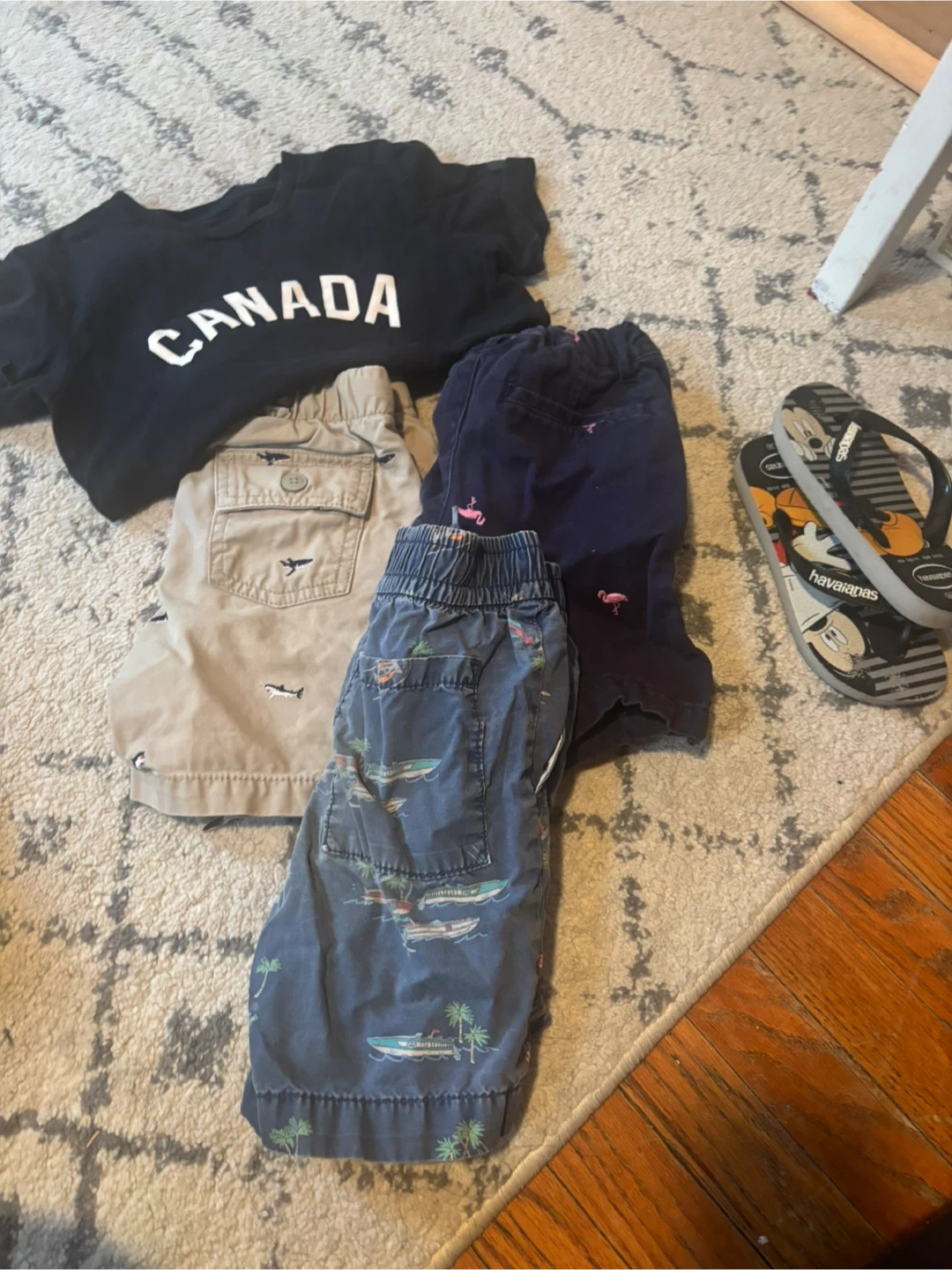 Selling a bundle of kids' clothing including a Canada T-shirt, several pairs of shorts, and Havaianas flip-flops. The flip-flops feature a Mickey Mouse design. Great for summer