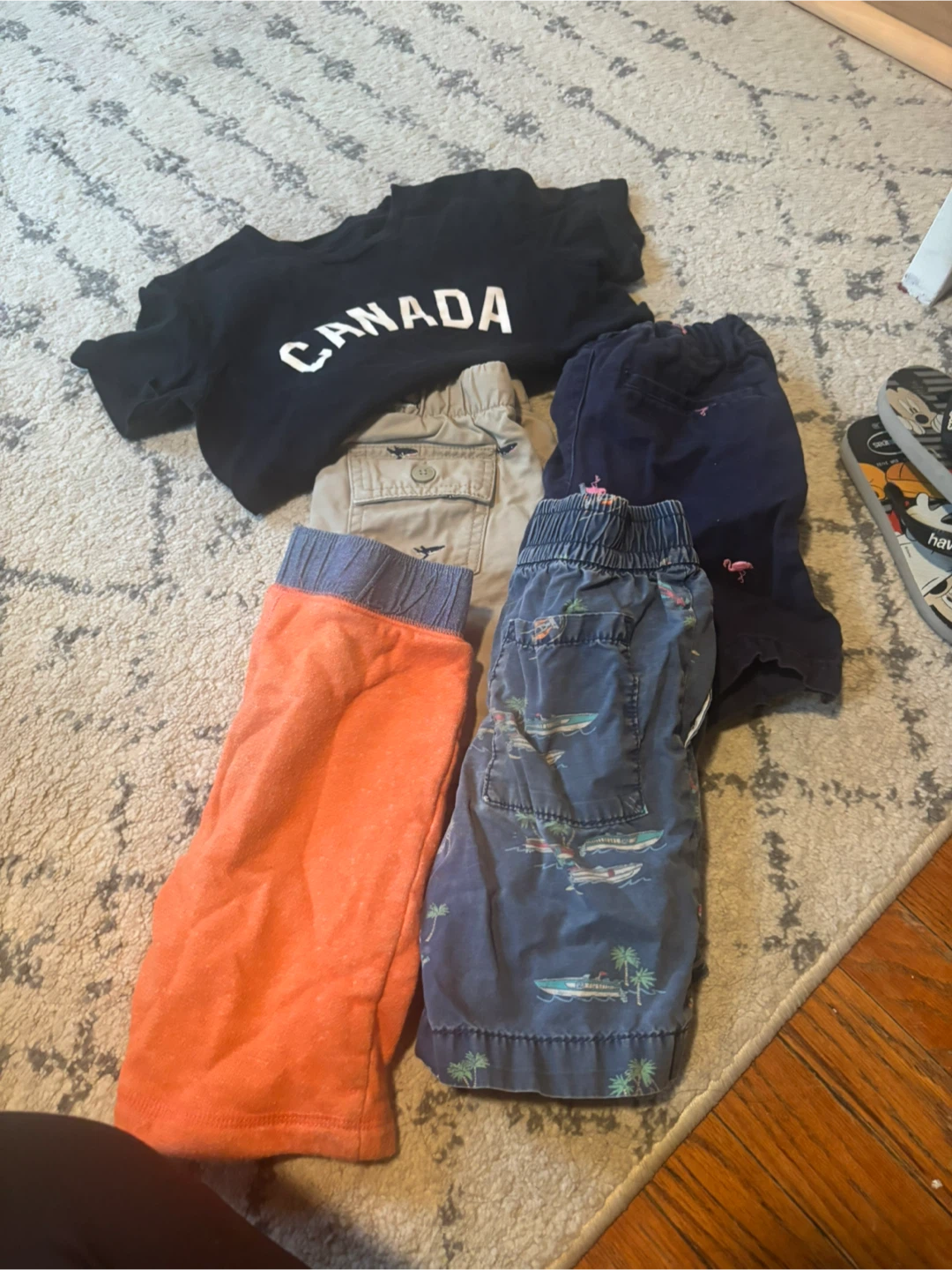 Selling a bundle of kids' clothing including a Canada T-shirt, several pairs of shorts, and Havaianas flip-flops. The flip-flops feature a Mickey Mouse design. Great for summer