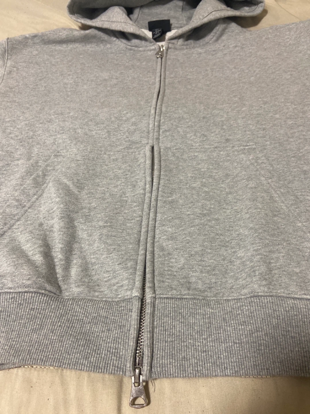 Selling a comfy H&M grey zip-up hoodie in a size large! It's a loose fit and made of 100% cotton.