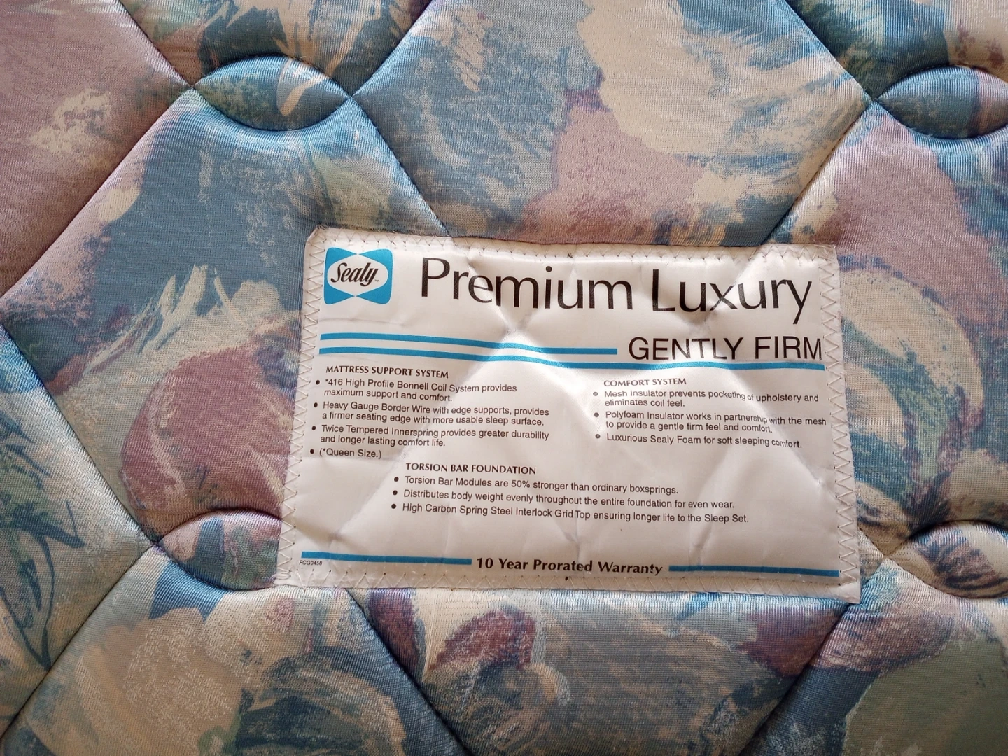 Selling a Sealy Premium Luxury mattress in gently firm. It's a queen size and features a '416 High Profile Bonnell Coil System' for support and comfort. The torsion bar modules are stronger than ordinary boxsprings. It also distributes body weight evenly throughout the entire foundation for even wear