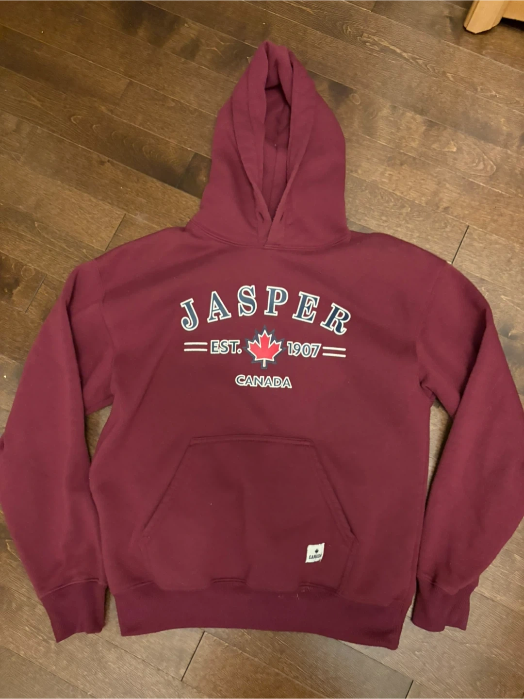 Selling a vintage Clothing Co Canadian hoodie in size XS. The hoodie is burgundy and features a Jasper Canada design. Great for a casual, comfy look!