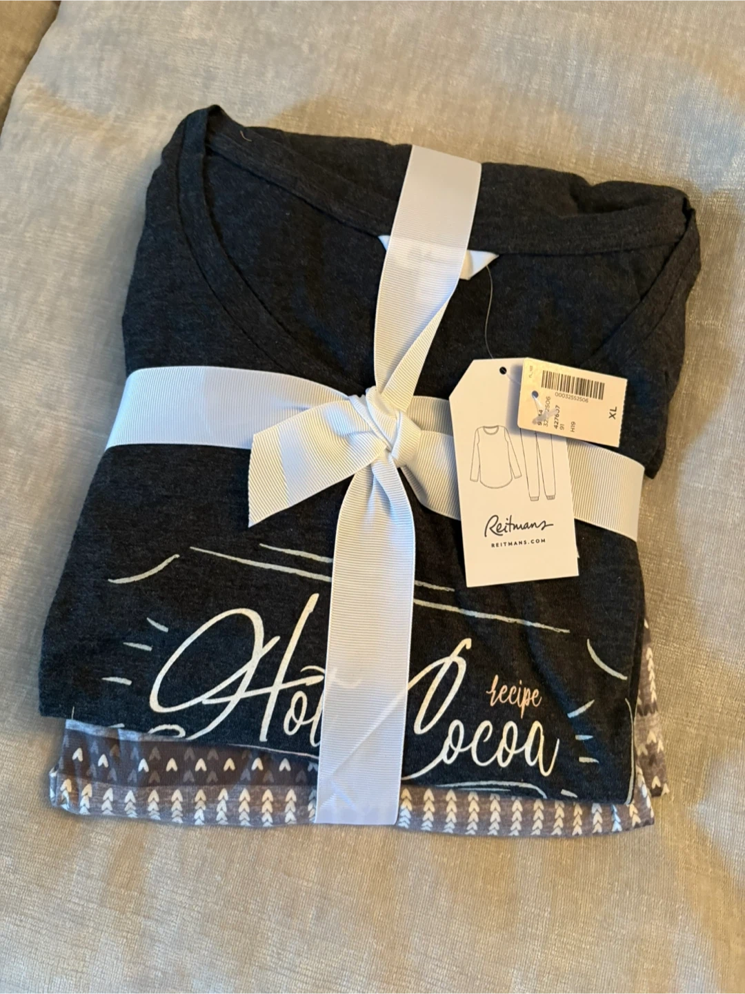 New Reitmans pajama set featuring a cute 'Hot Cocoa' design! This set is size XL and includes both the top and patterned bottoms. Perfect for cozy nights in or as a gift for the holidays.