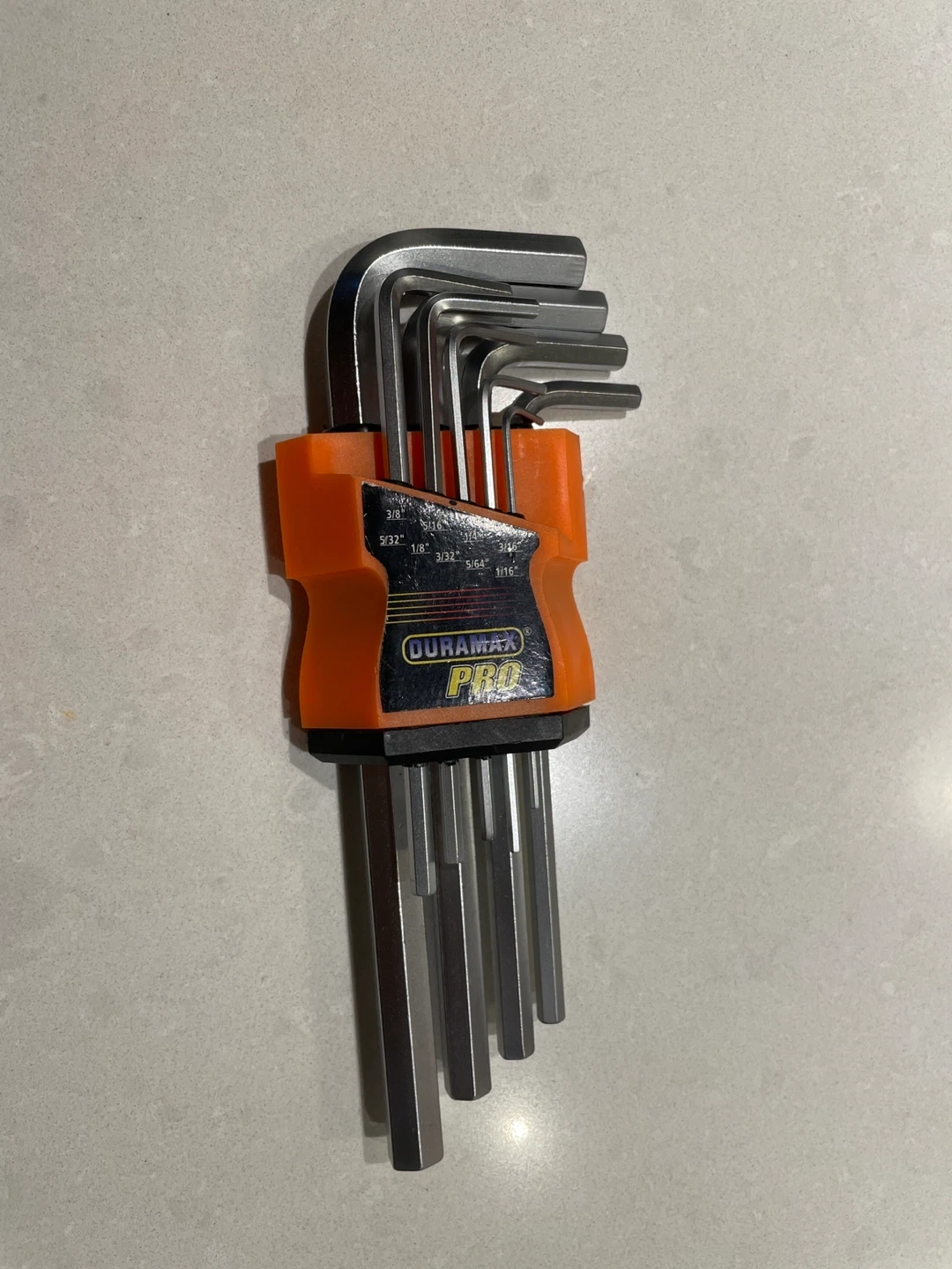 Selling a set of Duramax Pro SAE Allen wrenches. It includes a variety of sizes, from 1/16" to 3/8", all neatly organized in an orange holder. Great for any DIY projects around the house!