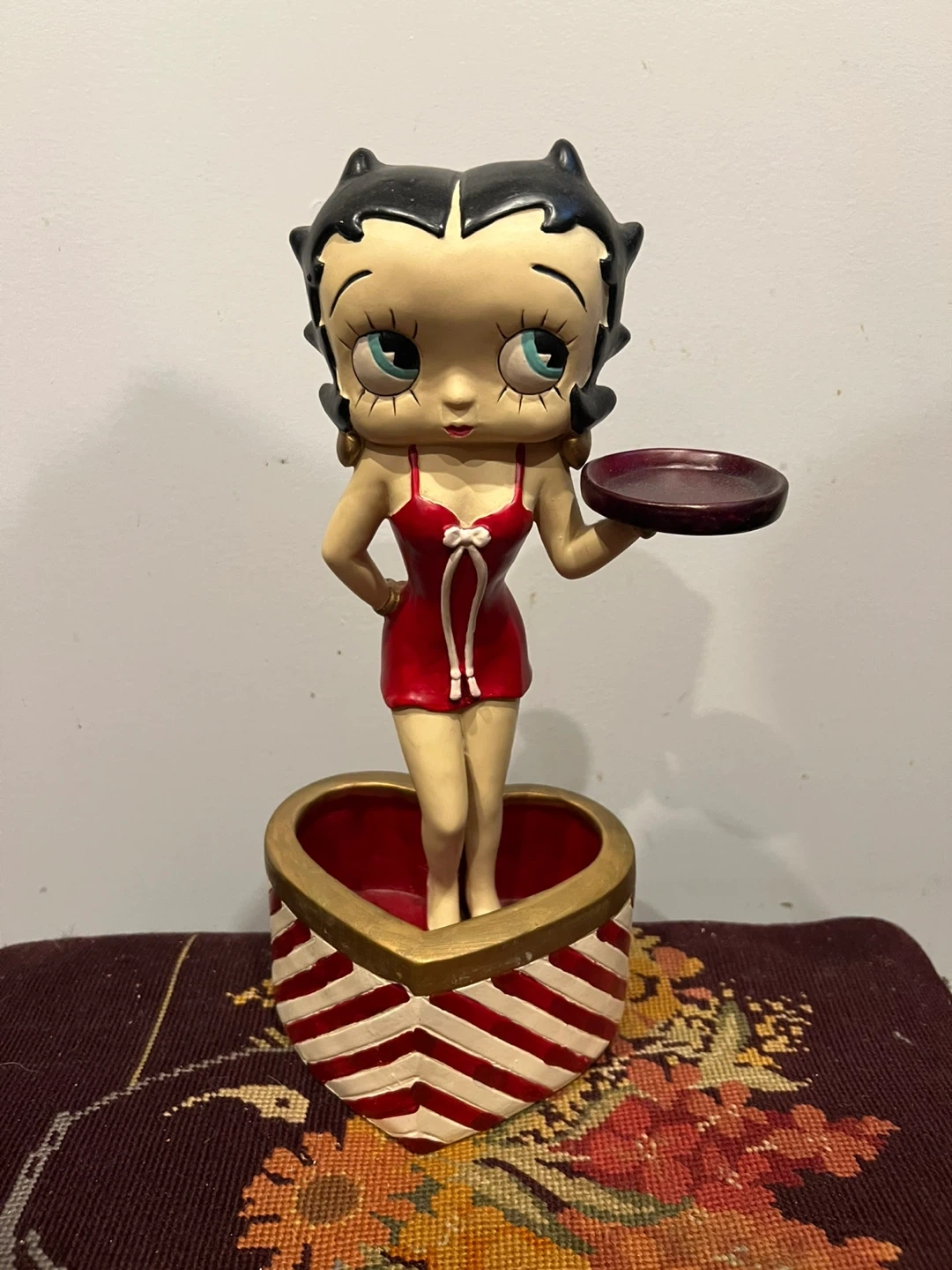 Here's a cute Betty Boop figurine! She's standing in a heart-shaped base with red and white stripes. She's holding a small tray and would look great as a decorative piece