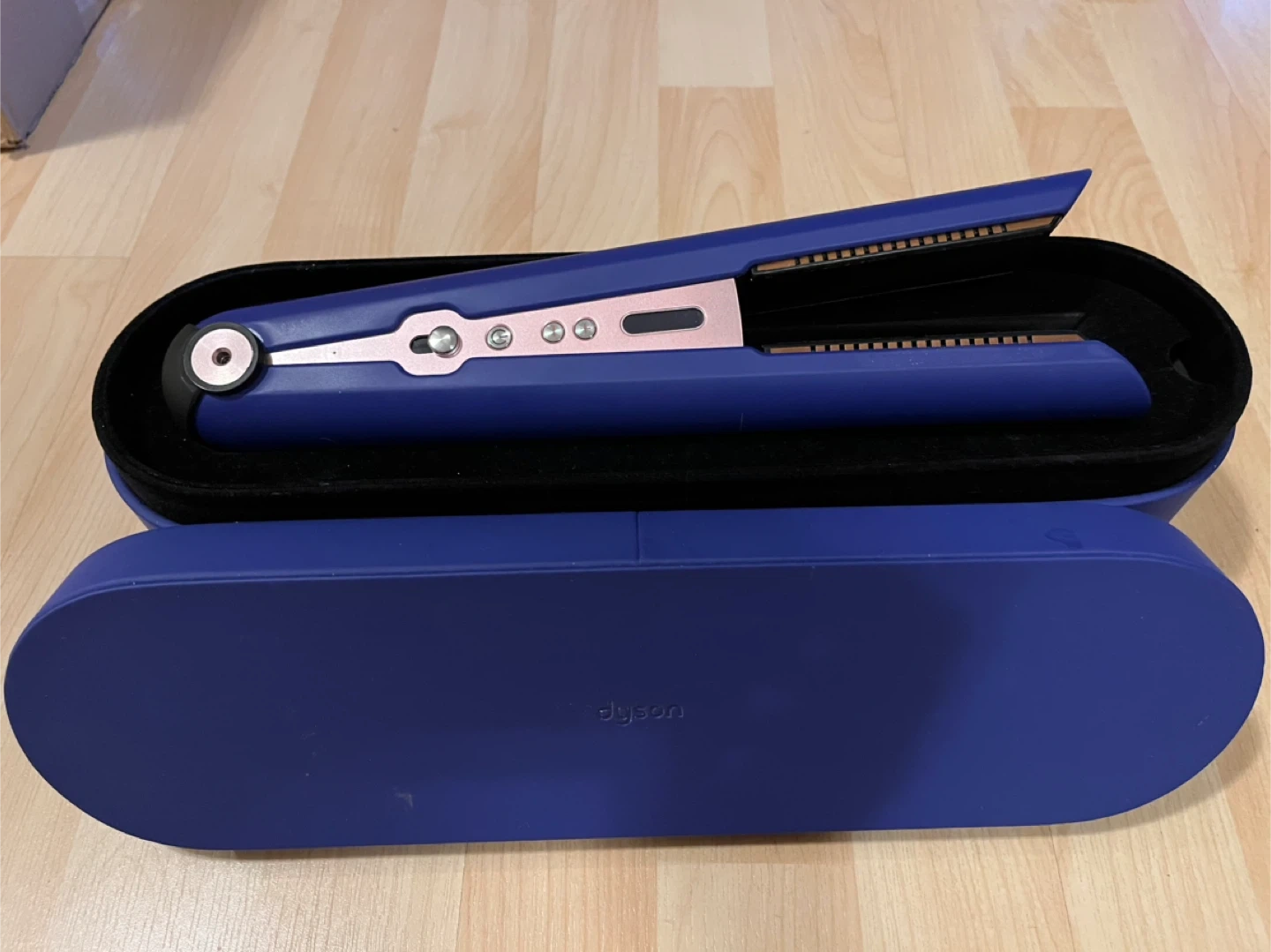 Selling a Dyson straightener in blue and copper. It's in great condition and comes with the original box and all components. It straightens hair using air, so it's less damaging than traditional straighteners