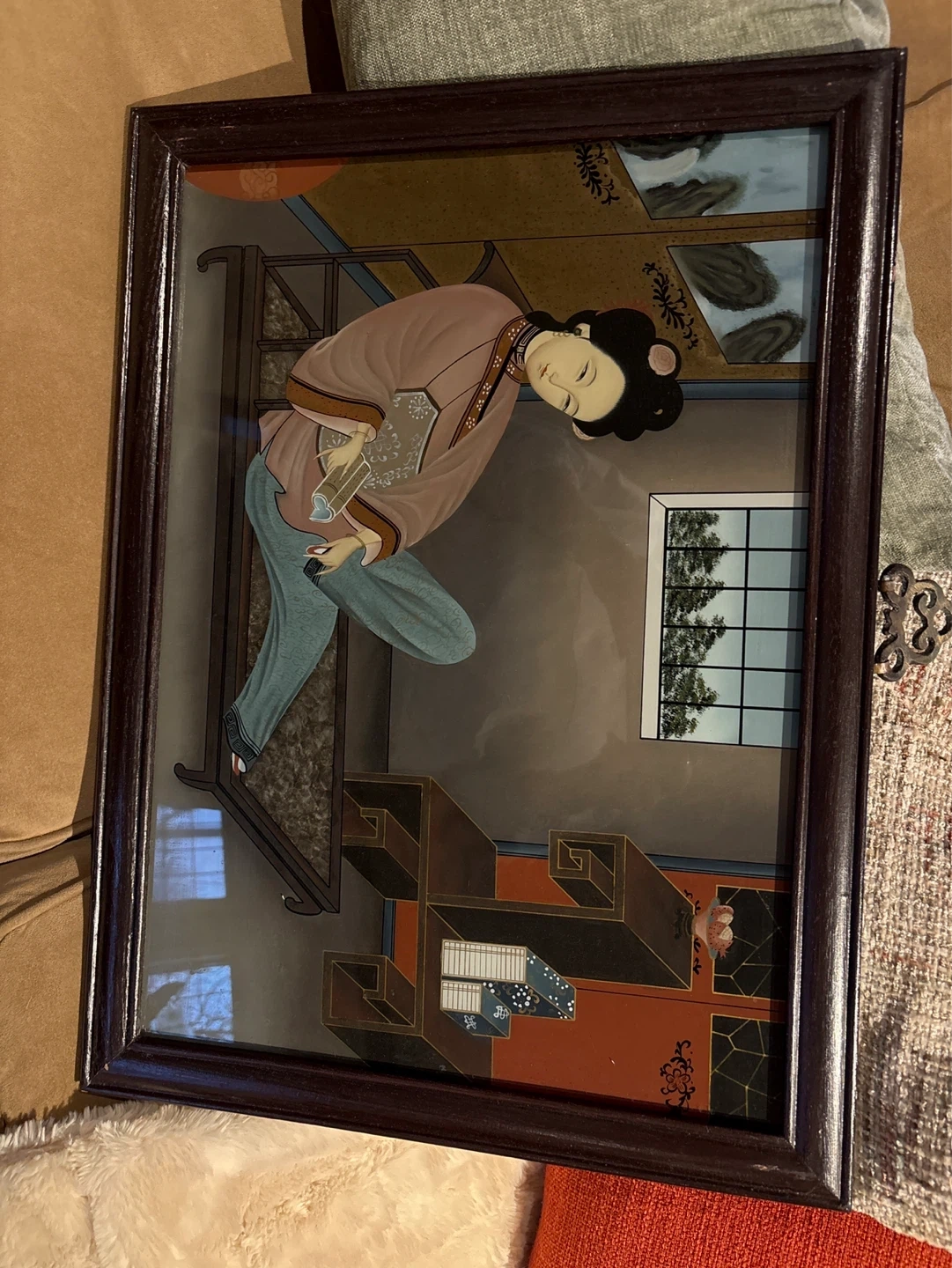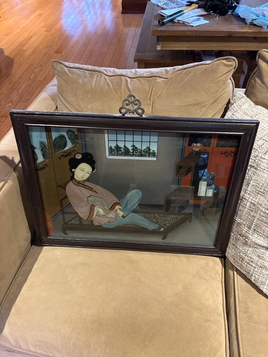 This framed artwork features a traditional reverse painting on glass. The scene depicts a woman in traditional attire within an interior setting. It's a unique piece of decorative art.