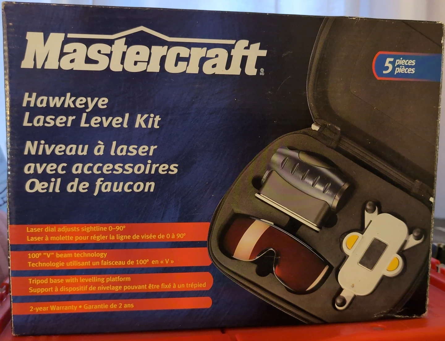 Selling a Mastercraft Hawkeye Laser Level Kit, complete with 5 pieces! It features 100° "V" beam technology and a tripod base with a levelling platform. The laser dial adjusts the sightline from 0-90°. Included is the operating manual.