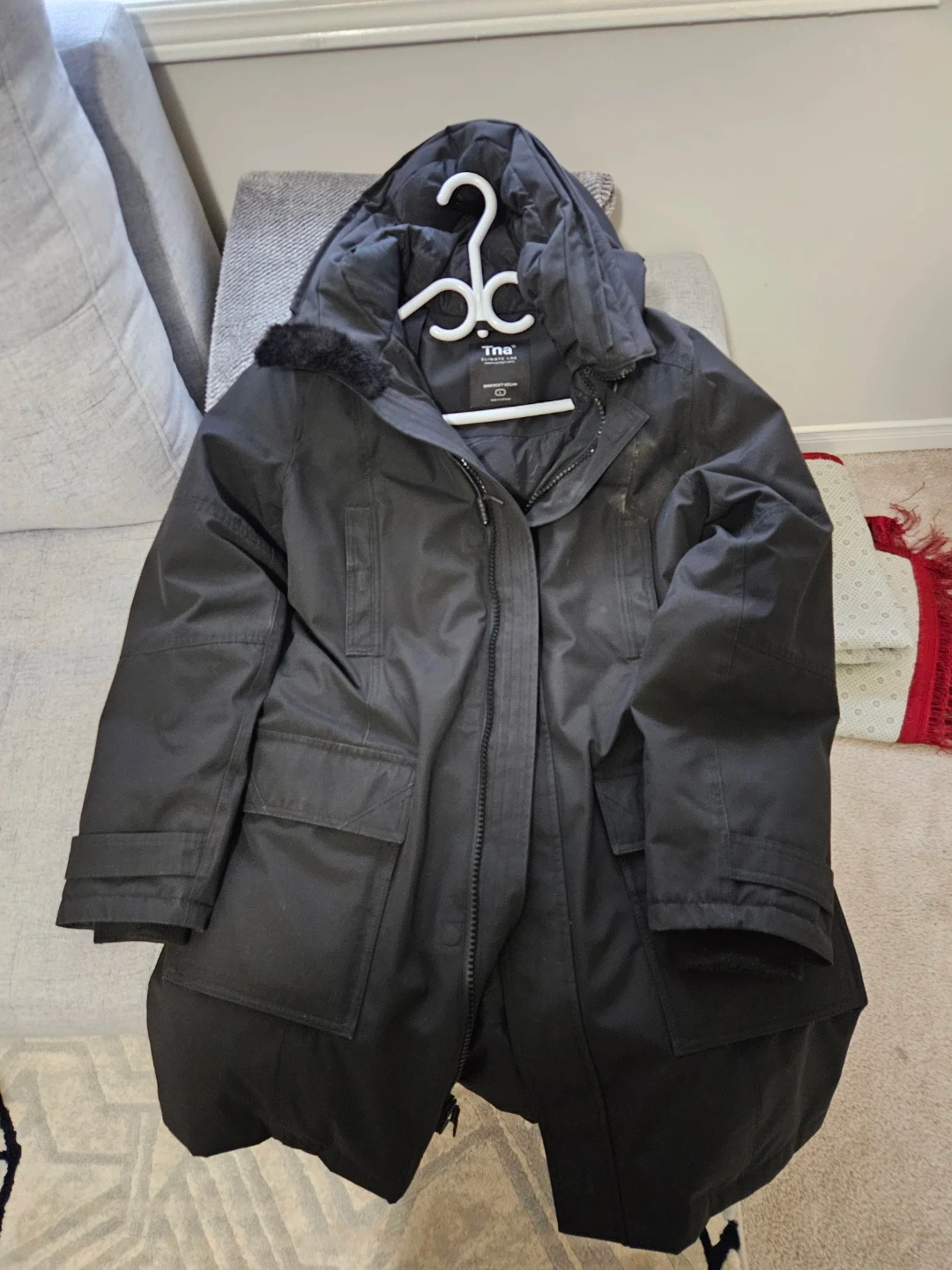 Selling a TNA Climate Parka in black! It's in great condition and perfect for the Canadian weather. It's a stylish and functional coat to keep you warm and dry during the colder months