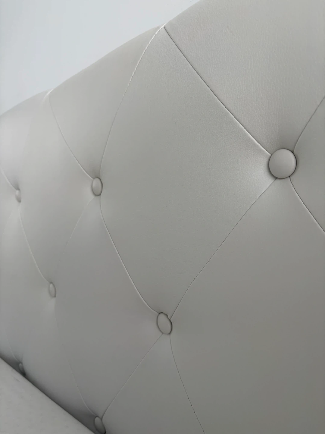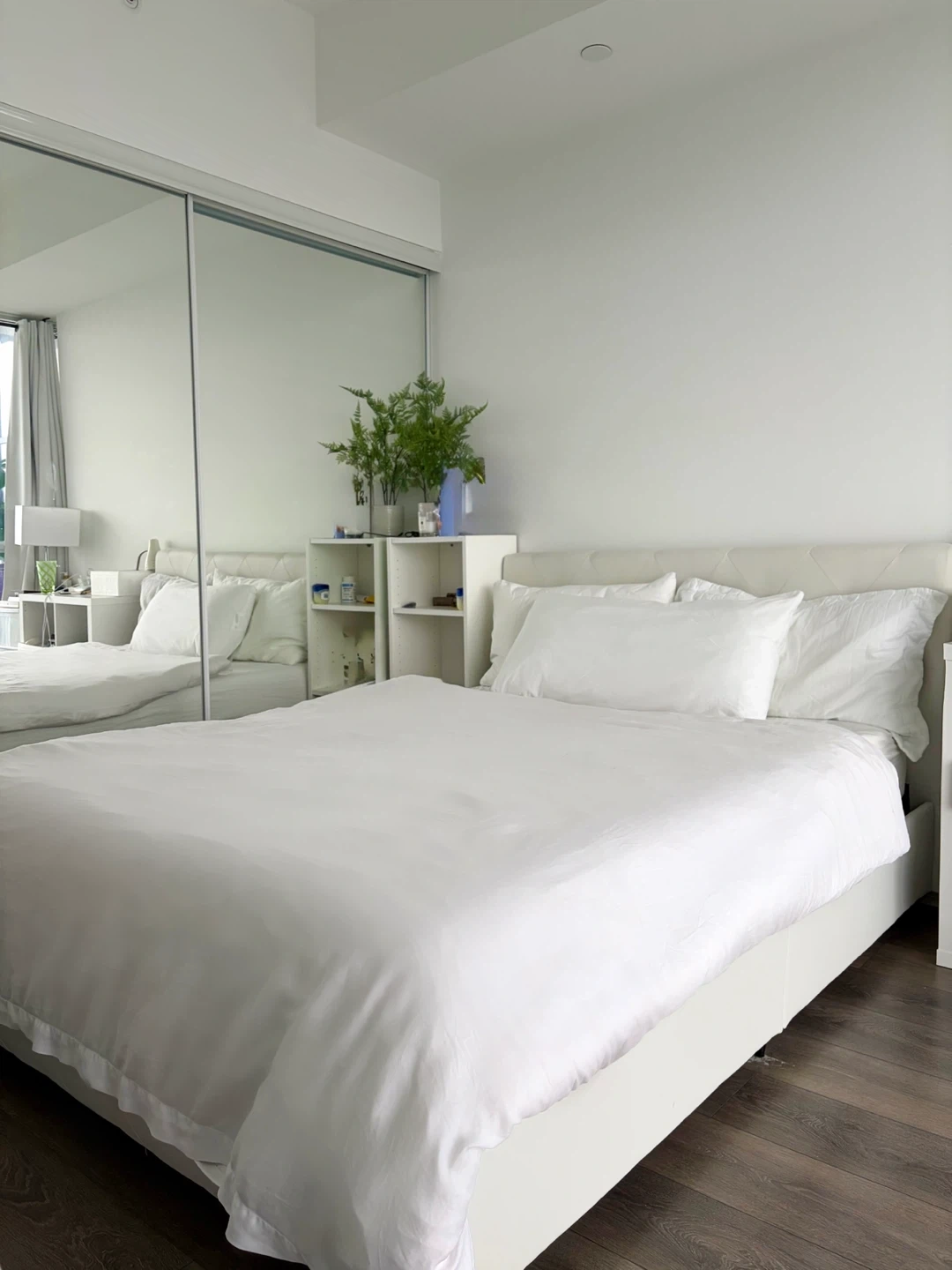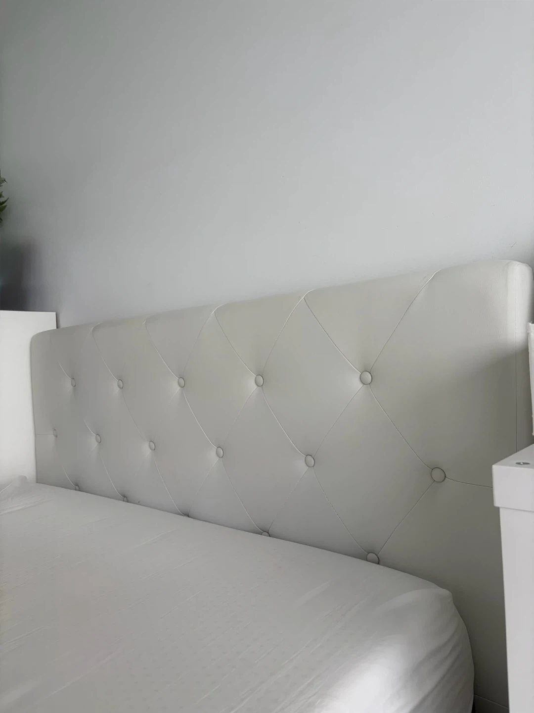 Double bed set that includes the upholstered headboard, bed frame, mattress, white duvet, and fitted sheet. Comfortable and modern, with a clean, minimal look that works well in condos or smaller bedrooms. The mattress has some light staining, but everything is fully functional and the bed looks great when set up.