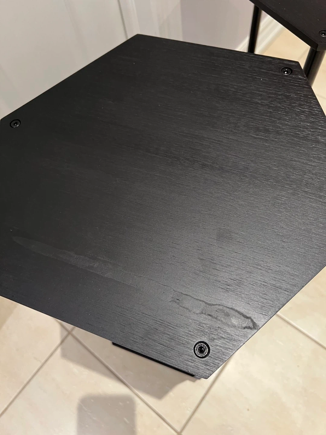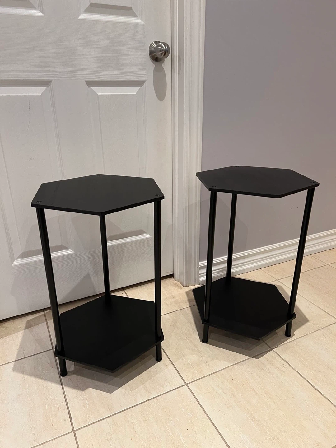 Selling a set of two hexagon-shaped side tables. They're in great shape and would look fantastic in any living room or bedroom! There are some minor signs of wear, as shown in the pictures, but overall they're very sturdy and stylish