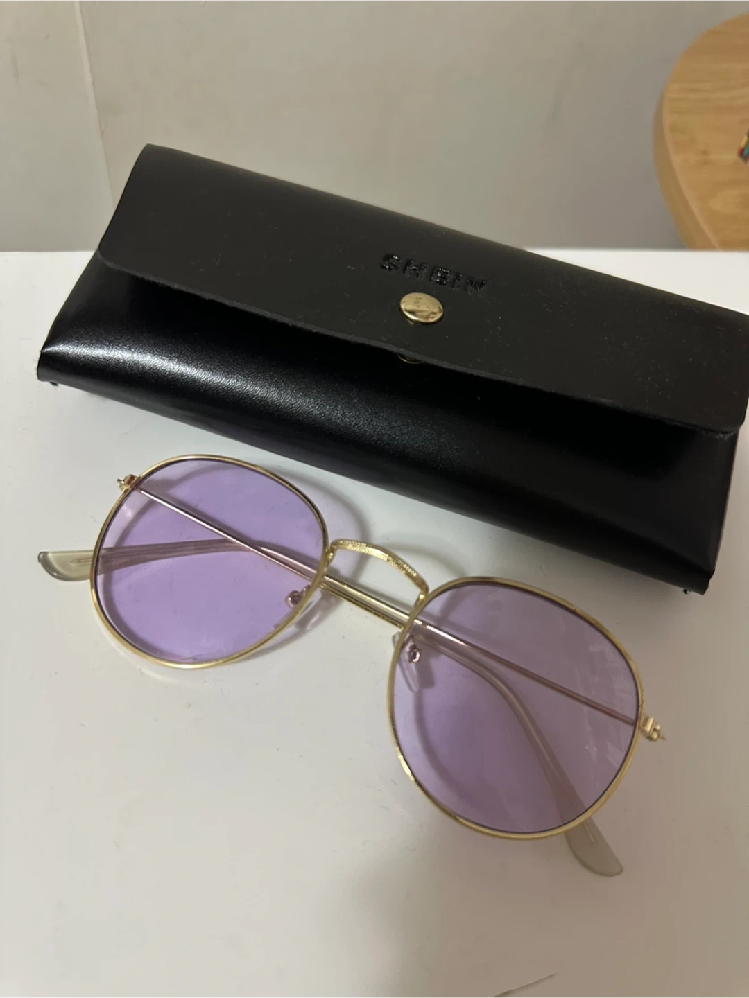 Selling a pair of Shein sunglasses with a gold frame and light purple lenses. They come with a black case.