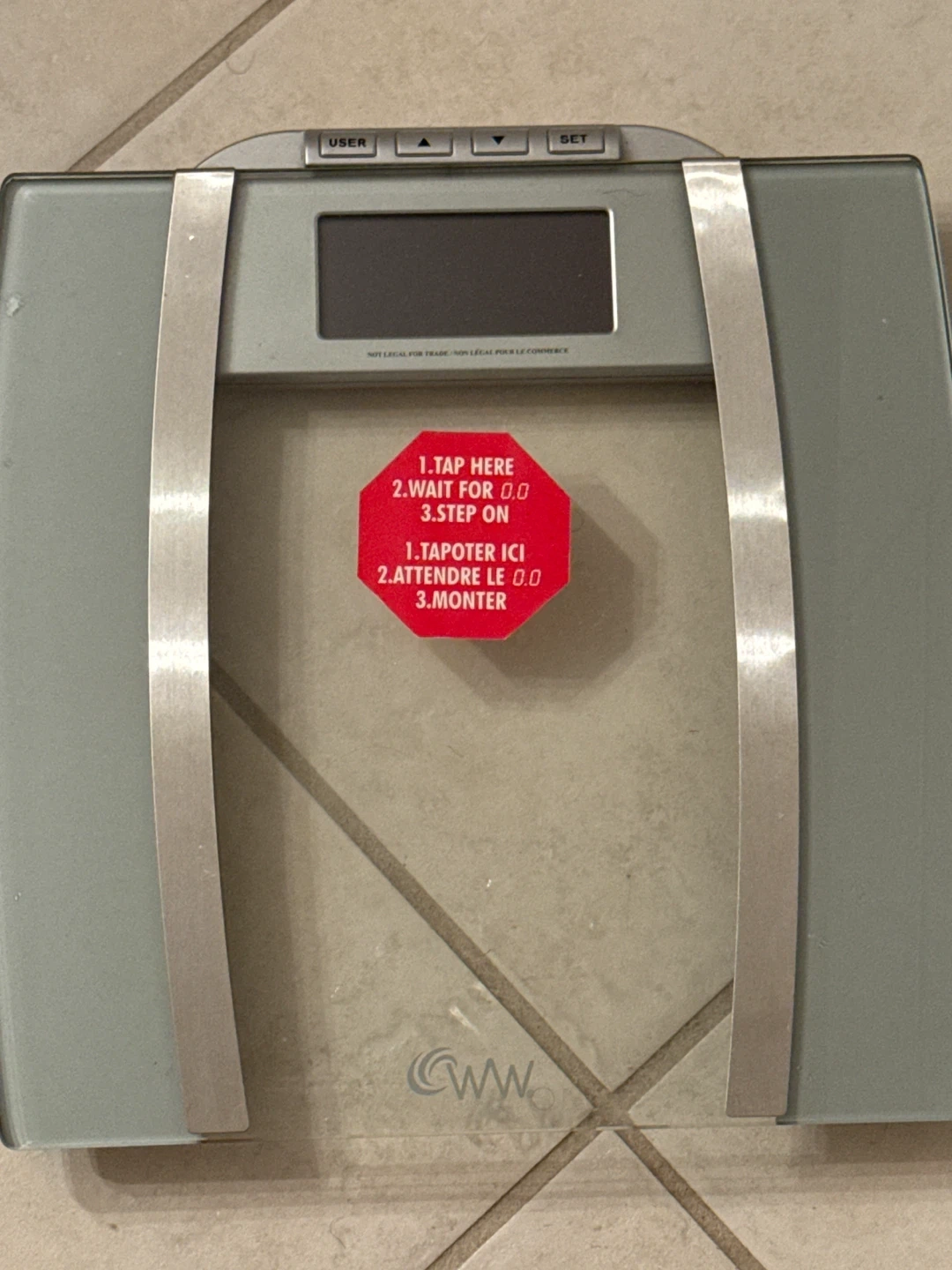 Selling a WW (Weight Watchers) digital glass scale. It's in great condition and ready for a new home! Features a clear digital display and a sleek glass design.