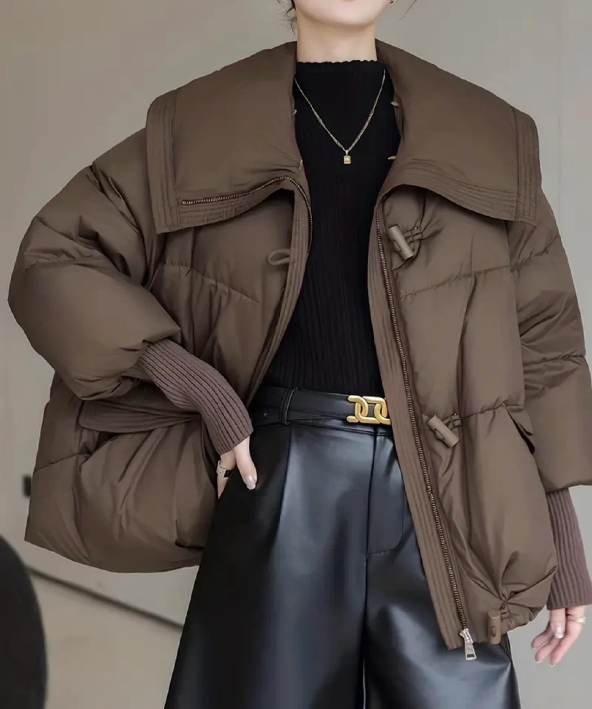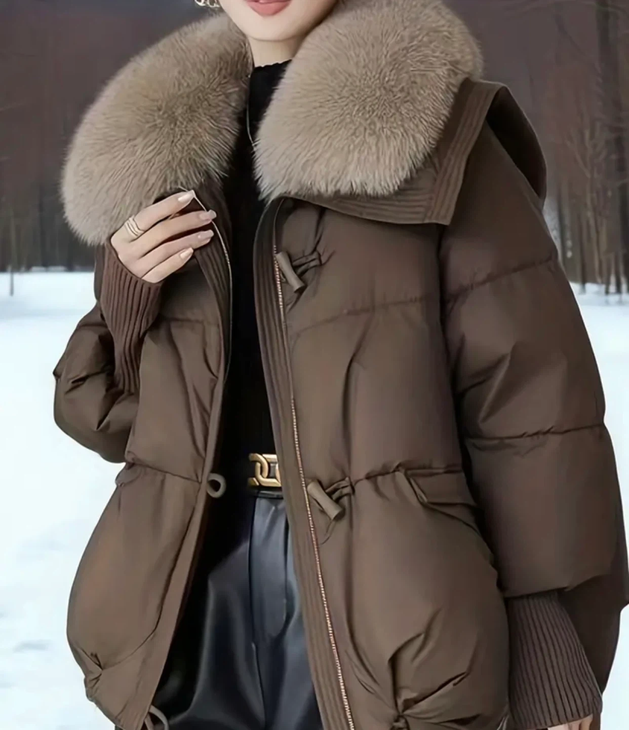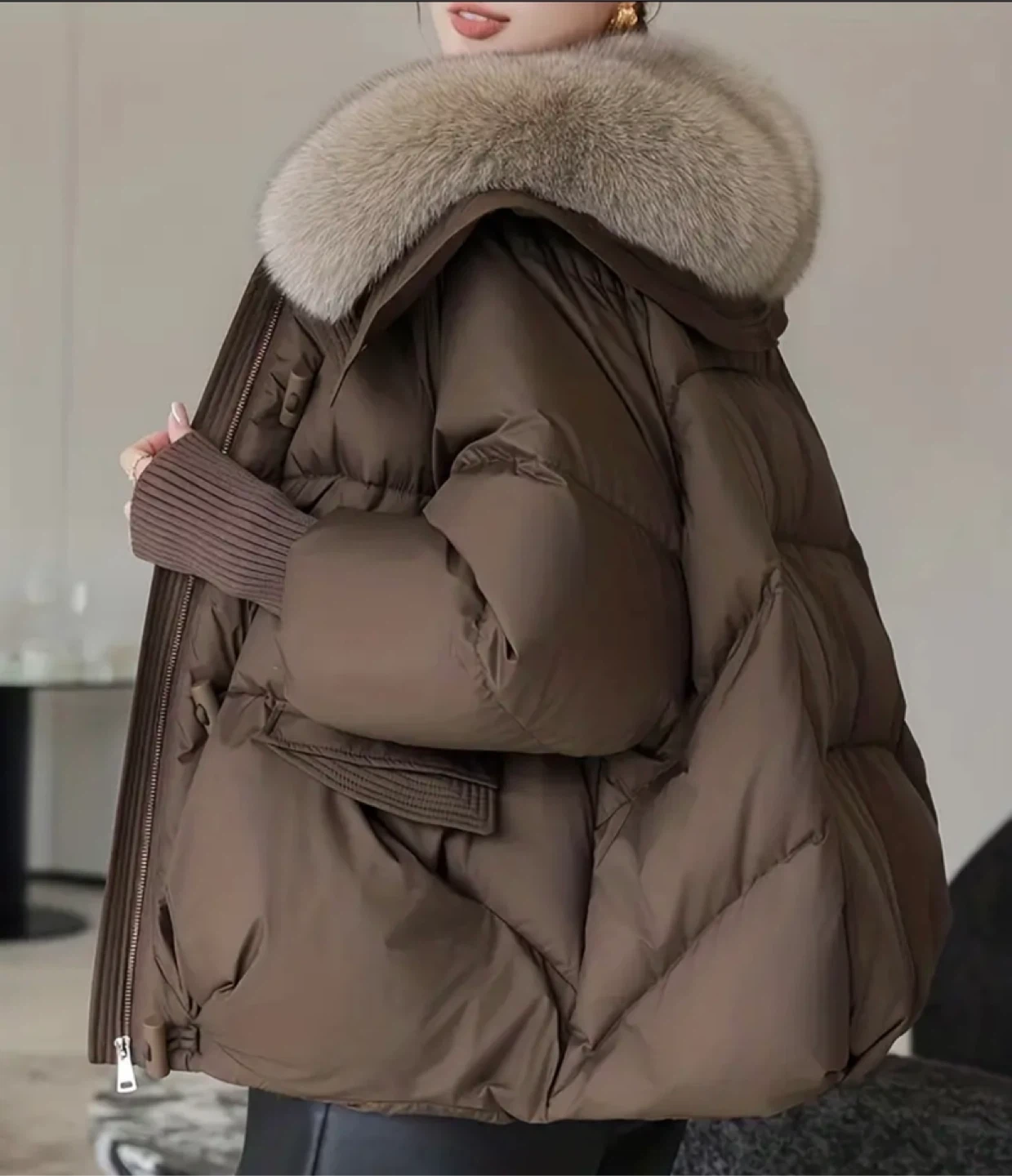 This is a stylish brown puffer jacket, perfect for staying warm and fashionable! It features a cozy fur collar and a comfortable, padded design. The color is a versatile brown that goes with everything