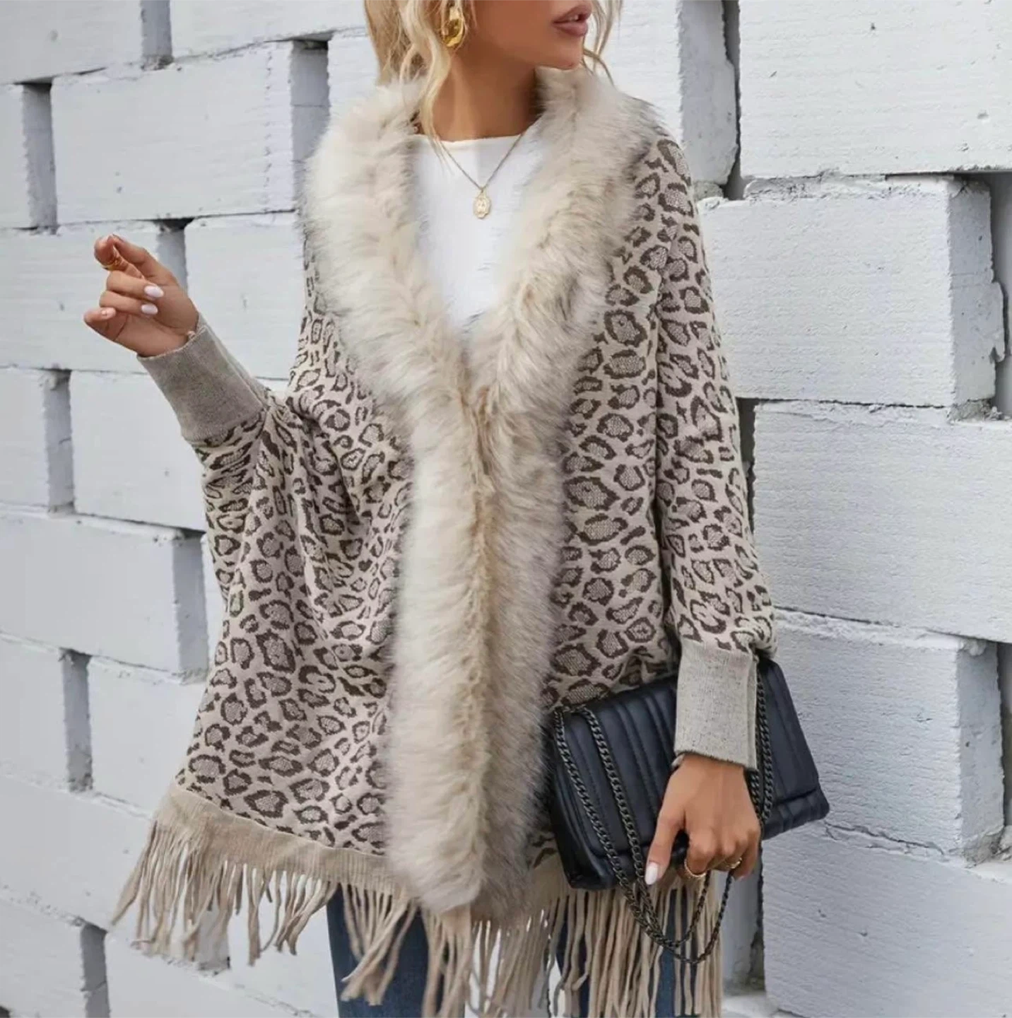 Stylish poncho with a fun leopard print and a cozy faux fur trim! It's got a nice fringe detail along the bottom. Perfect for adding a bit of flair to your outfit on a chilly day