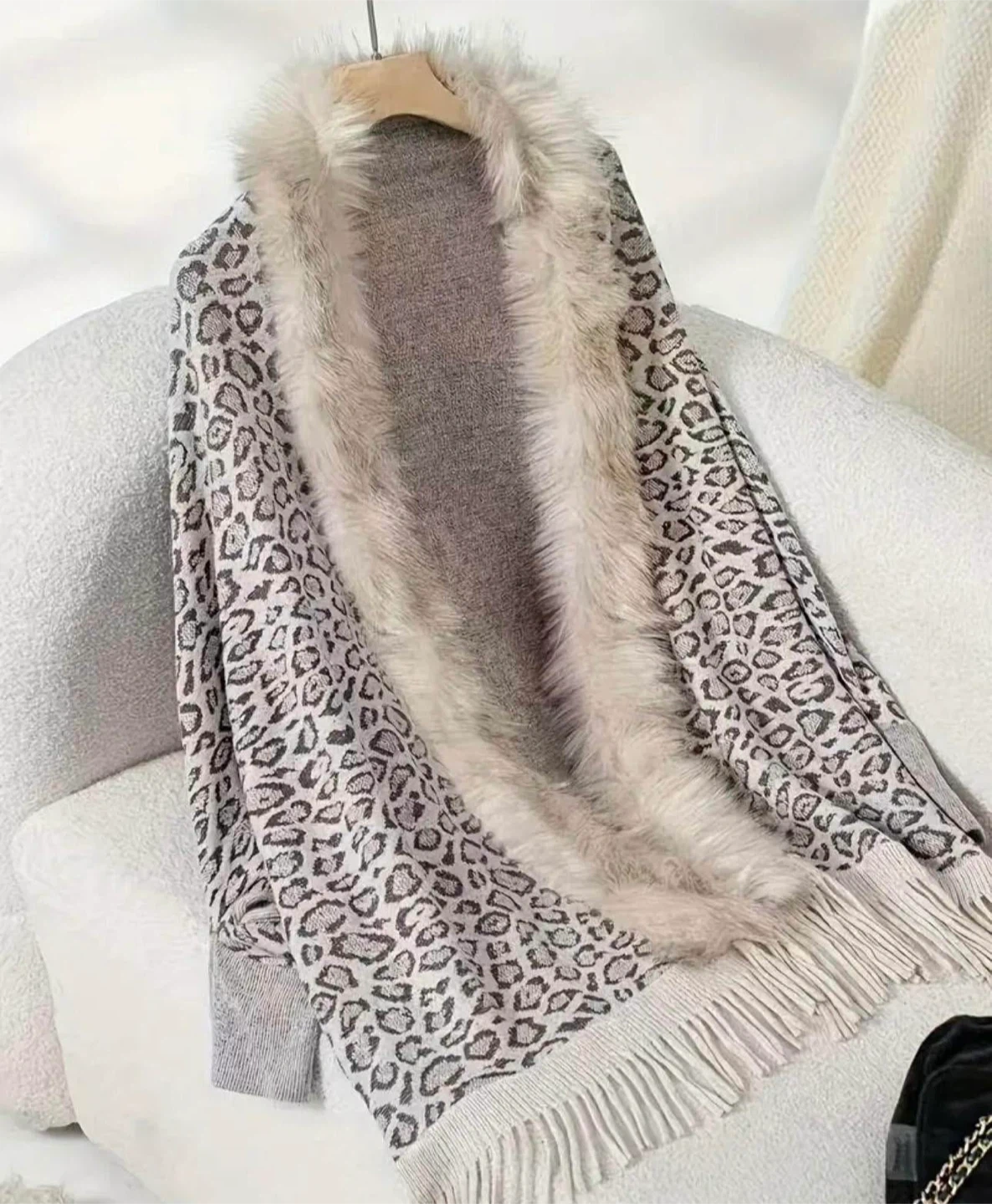 Stylish poncho with a fun leopard print and a cozy faux fur trim! It's got a nice fringe detail along the bottom. Perfect for adding a bit of flair to your outfit on a chilly day