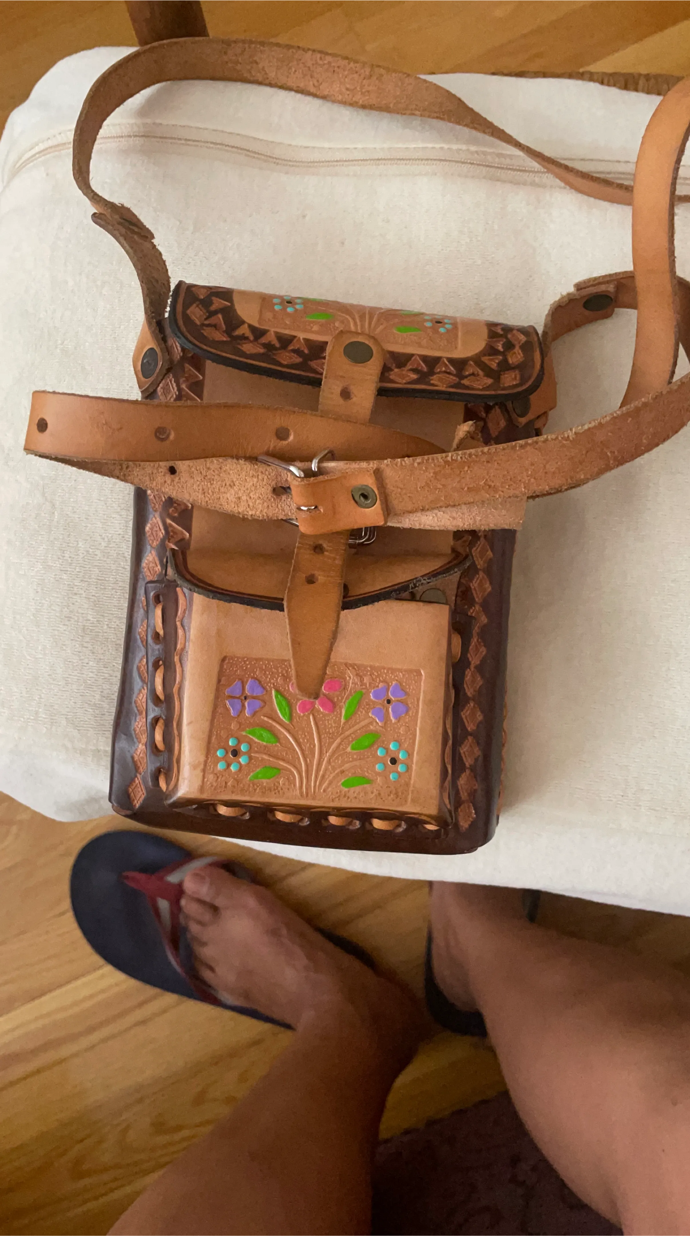 Selling a unique handmade leather shoulder bag! It features a beautiful floral design and a detailed, tooled leather finish. The bag has an adjustable strap and is perfect for carrying your essentials in style. It shows some signs of wear, adding to its vintage charm