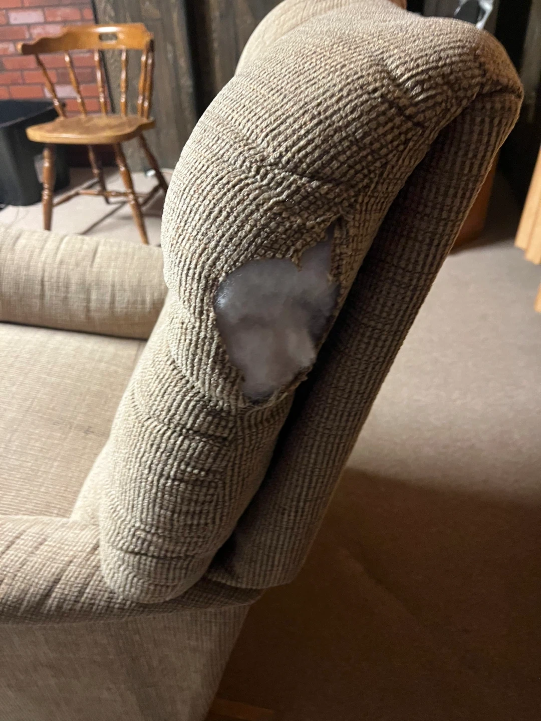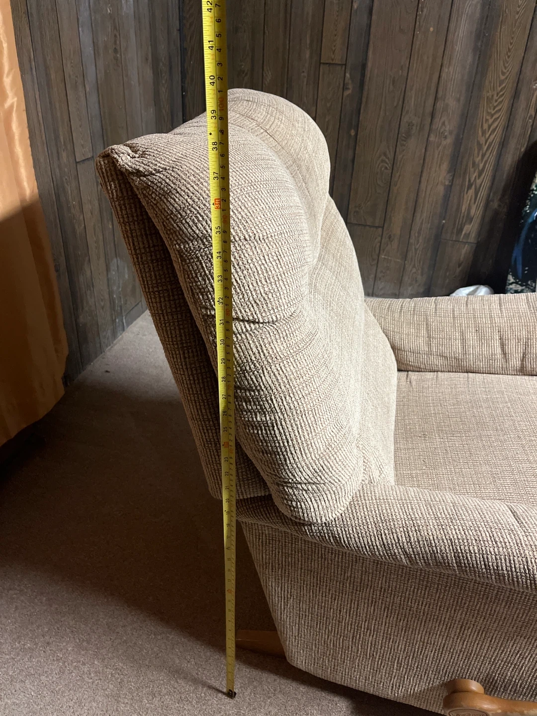 FREE comfy beige fabric recliner armchair! There's a small tear on the back, as shown in the pictures. You can cover with any blanket to hide tear. Size on the photos!