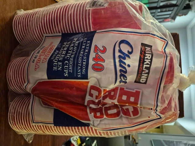 Most of a bag full of new Kirkland big red plastic cups. There are about 150 of the cups left (from 240). They're the 18 oz size. $5.00, pick up only