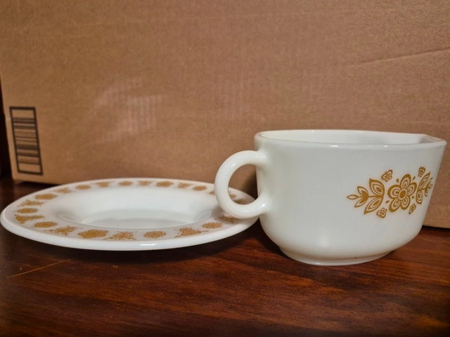 A vintage Pyrex gravy boat and underplate in the butterfly gold pattern is available. The gravy boat is model 77-B and the underplate is 77-U. Pattern is vibrant and no chips or cracks. $20.00, pick up only