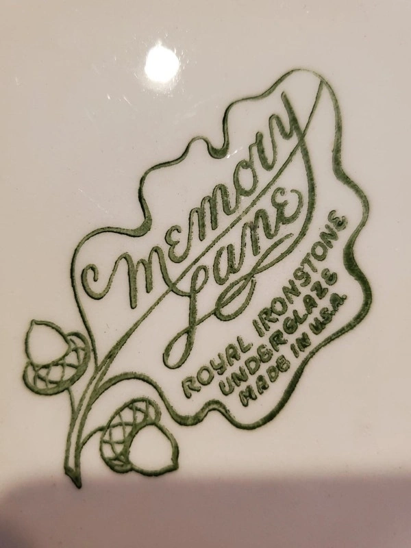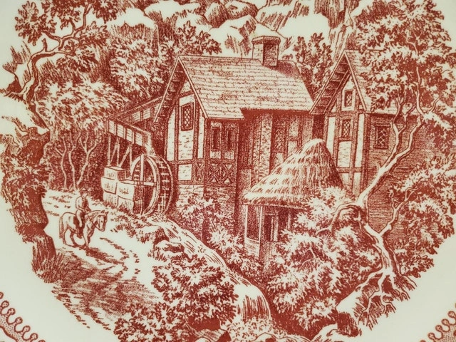0Nice vintage transferware plate made in the USA by Memory Lane. It's about 11.5" across, including the handles. Works as a plate, small platter or cake stand.