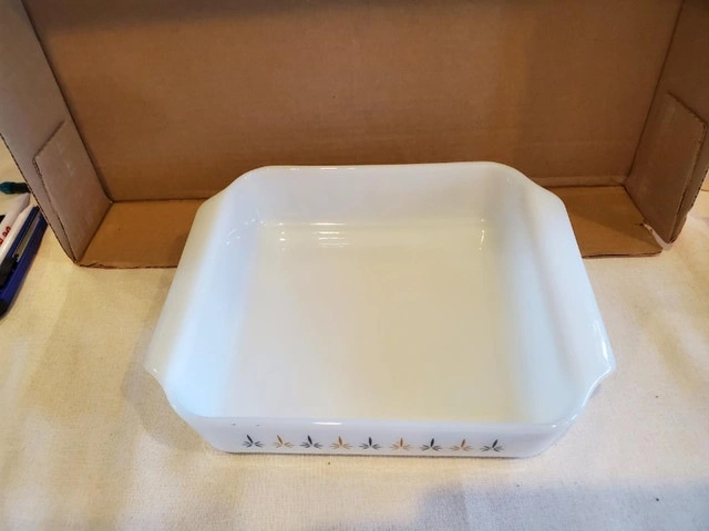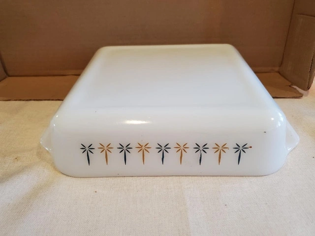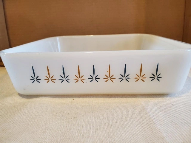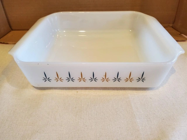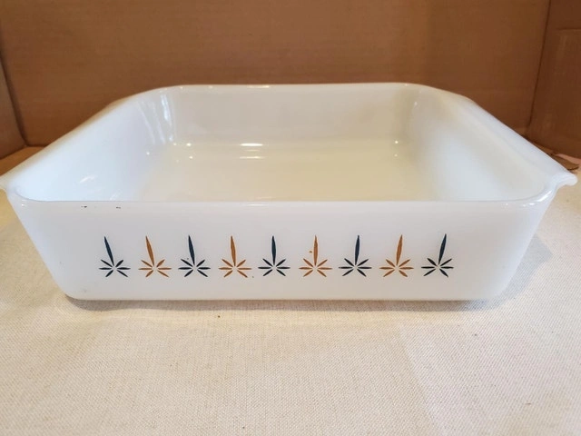 0A vintage Fire King baking dish. It's the Candle Glow Atomic Starburst pattern, model number 435. It's an 8” x 8" square baking dish. Great condition, $25.00, pick up only.