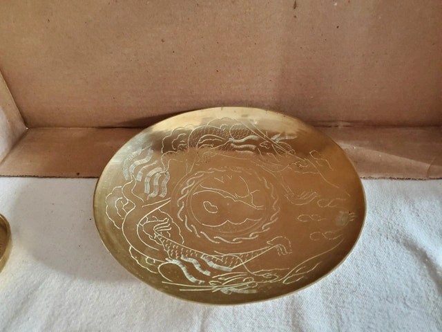 0I have four small brass decor items available at $5.00 each, pick up only: 2. Brass Trinket Box - 3.5" diameter, 2" tall 3. Small brass dish, floral pattern - 3.5" diameter 4. Larger shallow bowl, engraving on the front, 8" in diameter Condition: Used - Good For Sale By: Owner
