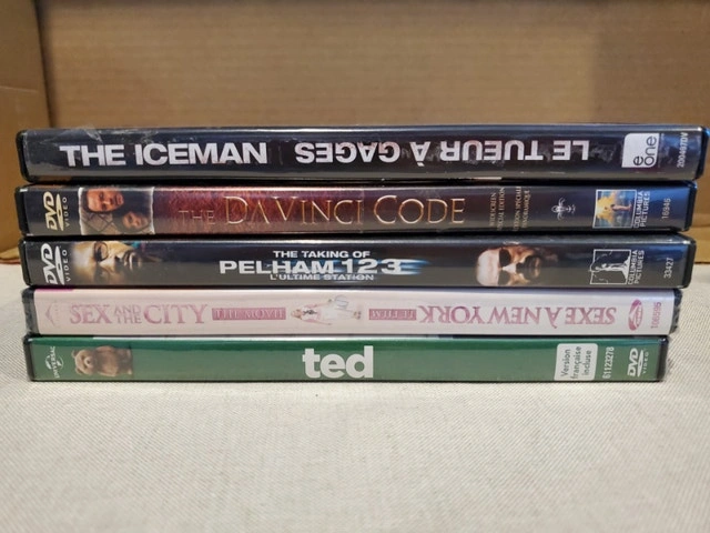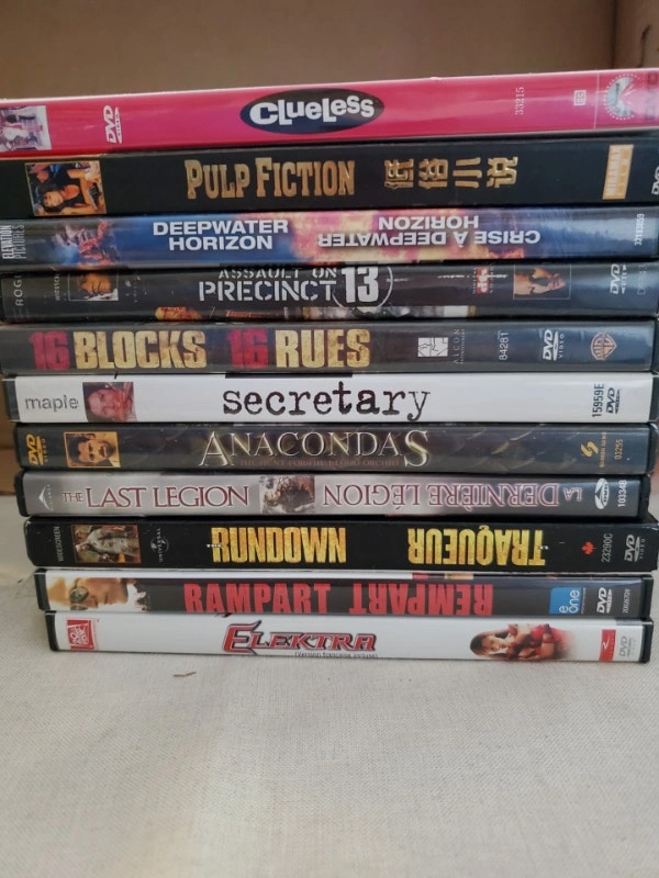 The following movies and TV series are available. $2.00 each or 3 for $5.00, pick up only: JUST ADDED: 16 Blocks – Widescreen (Bruce Willis, Mos Def, David Morse) Burlesque (Cher, Christina Aguilera) Capote (Philip Seymour Hoffman) Deepwater Horizon (Mark Wahlberg, Kurt Russell, John Malkovich) Elektra (Jennifer Garner) Fear dot com (Stephen Dorff, Natascha McElhone, Stephen Rea) Knowing Predictions (Nicolas Cage) MacGruber (Unrated Edition included) Pulp Fiction Rampart (Woody Harrleson, Ned Beatty Ben Foster, Anne Heche) Reefer Madness (in colour) Secretary (James Spader, Maggie Gyllenhaal) Sex and the City - The Movie - new, still sealed, full screen edition Ted - new, still sealed The Davinci Code The Iceman The Taking of Pelham 123 The Wrestler (Mickey Rourke) Walk the Line – Widescreen About a Boy Alien vs Predator Bewitched Blood Diamond Bridget Jones’s Diary Bridget Jones: The Edge of Reason Cars (full screen) Catching Fire (just the DVD, the Blu Ray copy is missing) Chicago Down with Love – Full screen Elvis: One Night With You – Re-enactment starring Mark Andrew Fifty Dead Men Walking Grey’s Anatomy Season 1 (9 episodes, 2 discs) Grindhouse Presents: Planet Terror - 2 disc special edition Jack Reacher (new, still sealed) Joe Cocker – Special Edition EP Jonah – A Veggie Tales Movie Julie and Julia (new, still sealed) Life of Brian Mamma Mia! – 2 Disc Special Edition Miss Congeniality 2: Armed and Fabulous (Full-Screen edition) National Lampoon’s Spring Break Out for Justice – Steven Seagal Pingu South Pole Adventures Private Buckaroo – Even the Jeeps are Jivin’ – Andrews Queen of the Damned Quigly Down Under Resident Evil – Special Edition Resident Evil: Extinction Resident Evil: The Final Chapter Sex and the City – Season 1 Sex and the City – Season 2 Sex and the City – Season 3 Sex and the City – Season 4 Sex and the City – Season 5 Sex and the City – Season 6 part 1 Sex and the City – Season 6 part 2 Sex and the City – The Movie Sex and the City – 2 Spain – On the Road Again – A culinary road trip Steve Martin Wild and Crazy Comedy Collection (3 movies) Taking Lives – Unrated Director’s Cut The Chronicles of Riddick The Divorce The Expendables 2 The Godfather The Hunger Games – 2 Disc DVD There’s Something More about Mary – 2 discs Thomas and Friends: On Site with Thomas Toy Story 3 Trailer Park Boys The Movie Wanted Why Did I get Married – The Play (Tyler Perry)