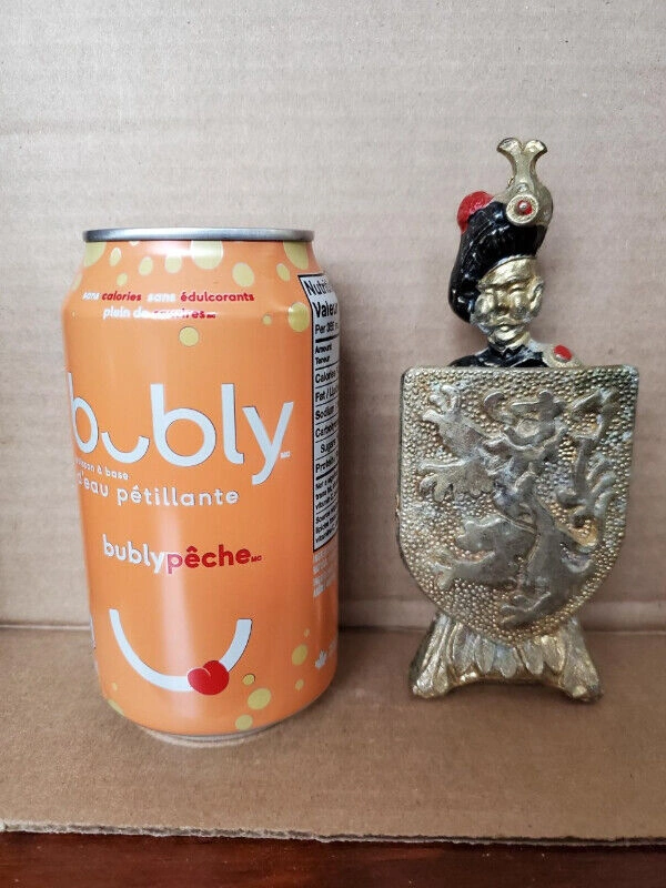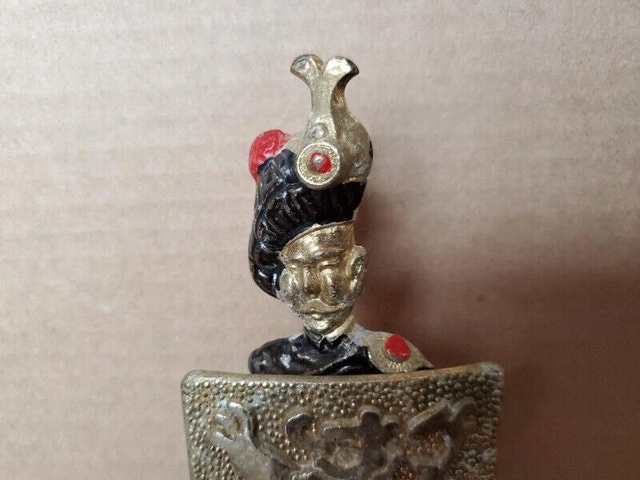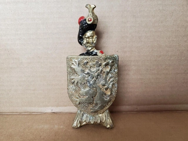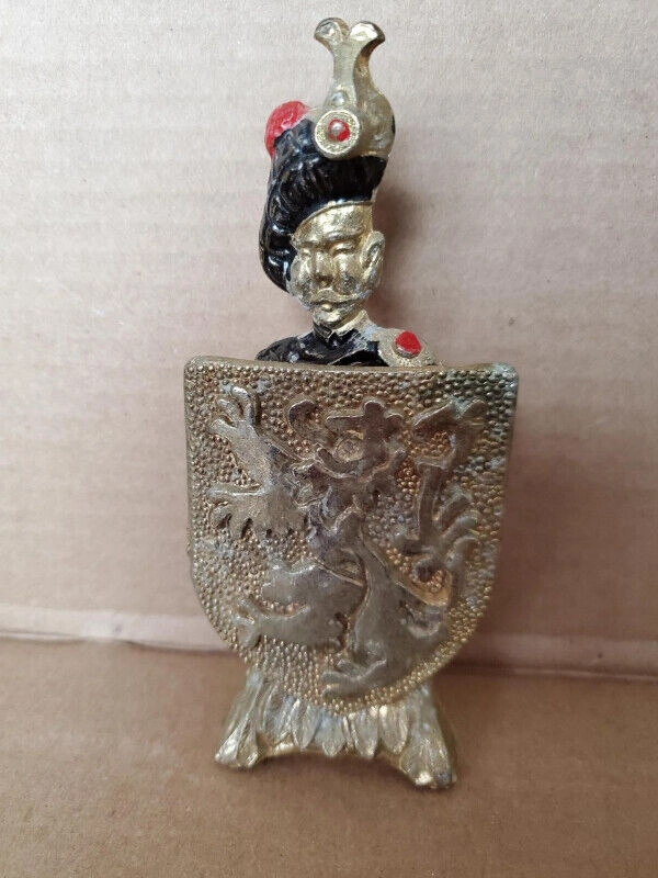 0Really nice vintage brass bottle opener. It's a Scottish figure on the bottle opener which clips into the stand. It's about 6" high and in fairly good vintage condition.