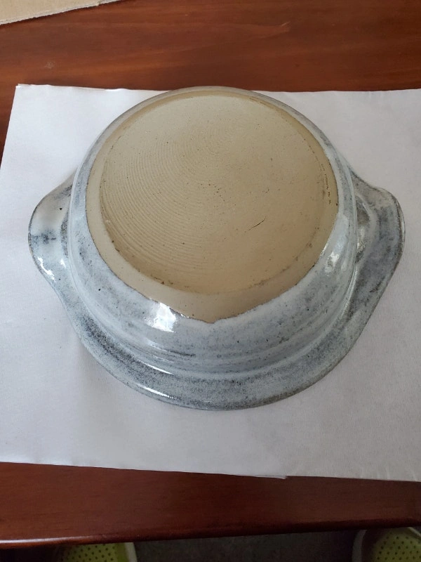 0Nice, handmade little pottery bowl with spouts. It has a lovely glaze and pattern in the centre. Measures 6.25" in diameter, 6.5" from spout to spout, and about 2" deep. $5.00, pick up only.