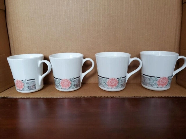 I have four cups and four saucers in the Silk & Roses Corelle pattern. Made by Corning and discontinued in the early 1990’s. $20.00 for all 8 pieces, pick up only.