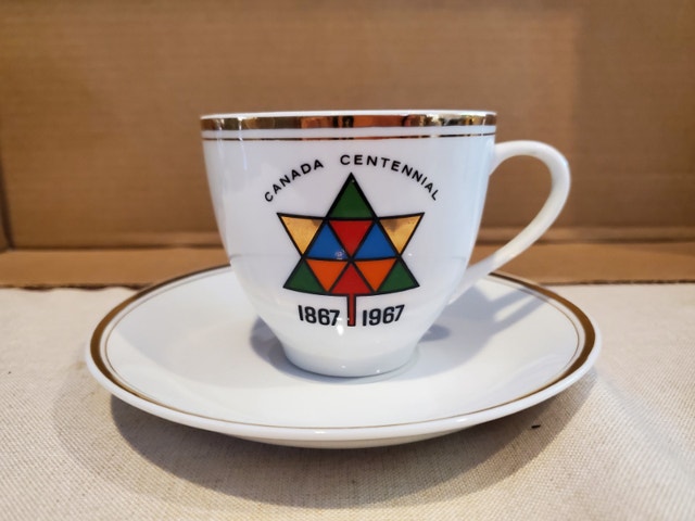 A nice vintage cup & saucer celebrating Canada's Centennial. Colours are vibrant and only a slight bit of wear on the gold rim. $10.00, pick up only.