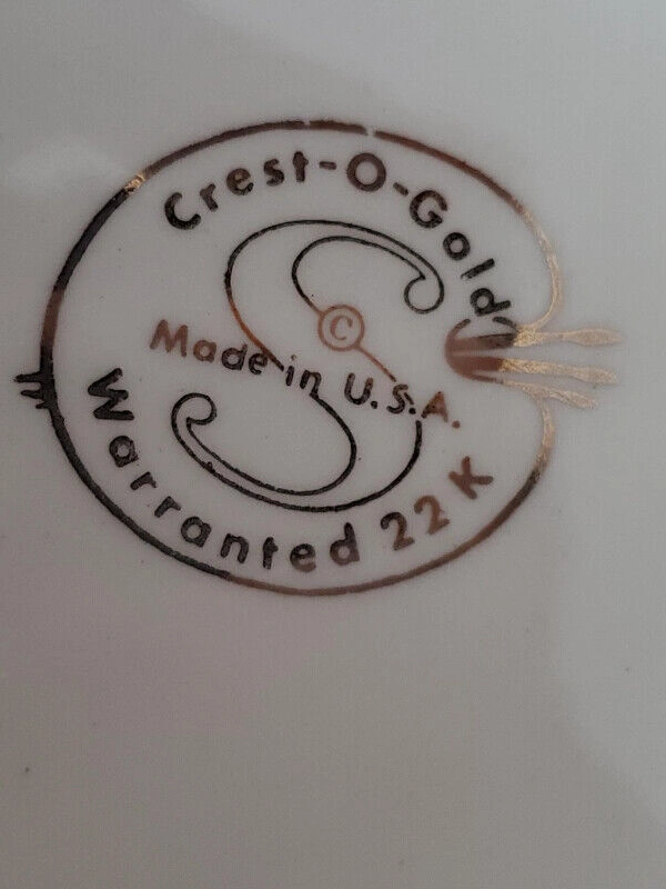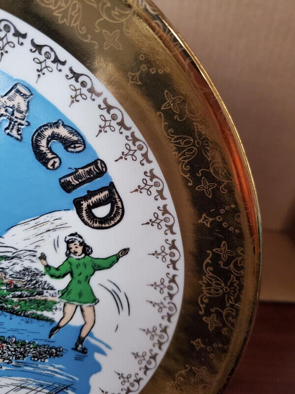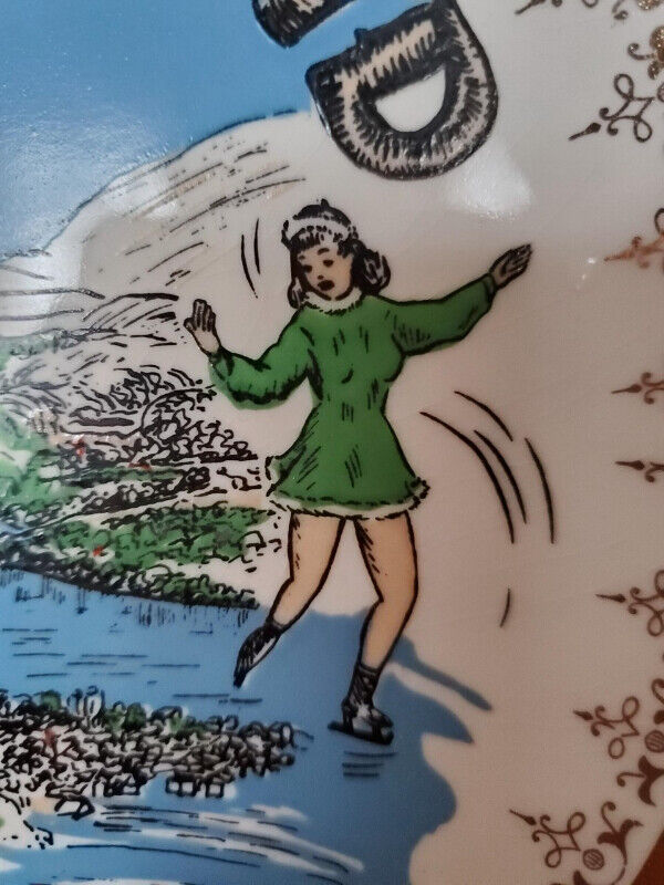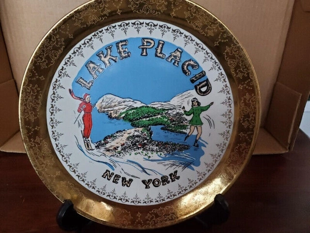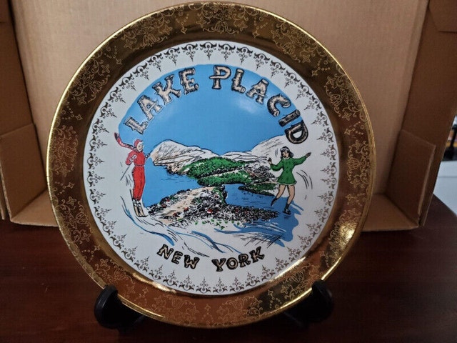 Fabulous vintage plate from Lake Placid, New York. Featuring a skier and a skater in the winter scene, the rim of the plate is done in 22 K gold. Made in the USA and marked "Crest-O-Gold", the plate is 9" in diameter. Asking $10.00, pick up only.