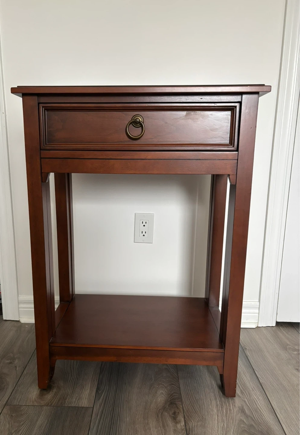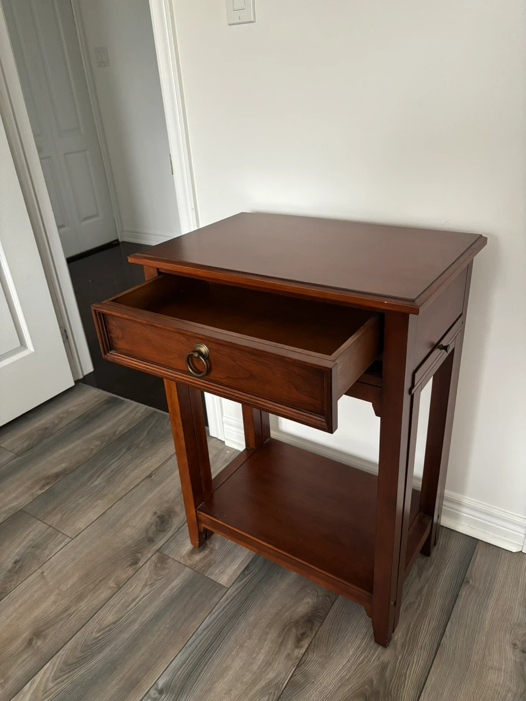 It features a drawer and a lower shelf for display or storage. It also features two extendable sides which double the surface measurement in size when pulled out.