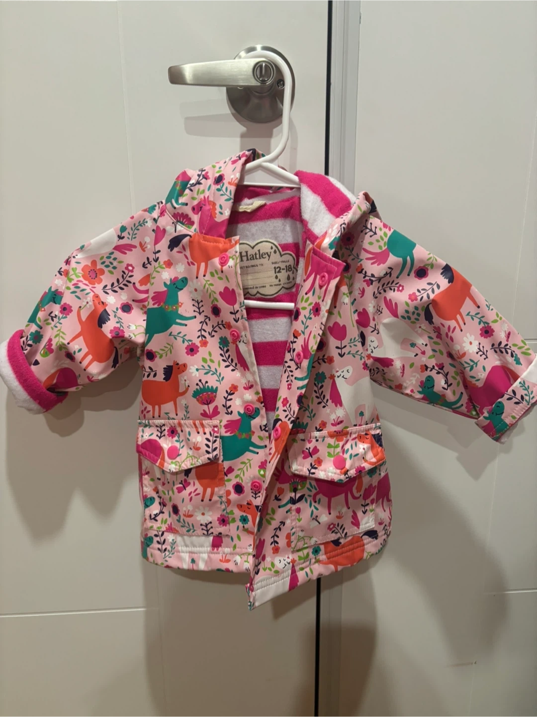 Super cute Hatley raincoat for your little one! It's sized for 12-18 months and features a fun, colourful pattern with horses and flowers. Perfect for keeping your kiddo dry on those rainy days!