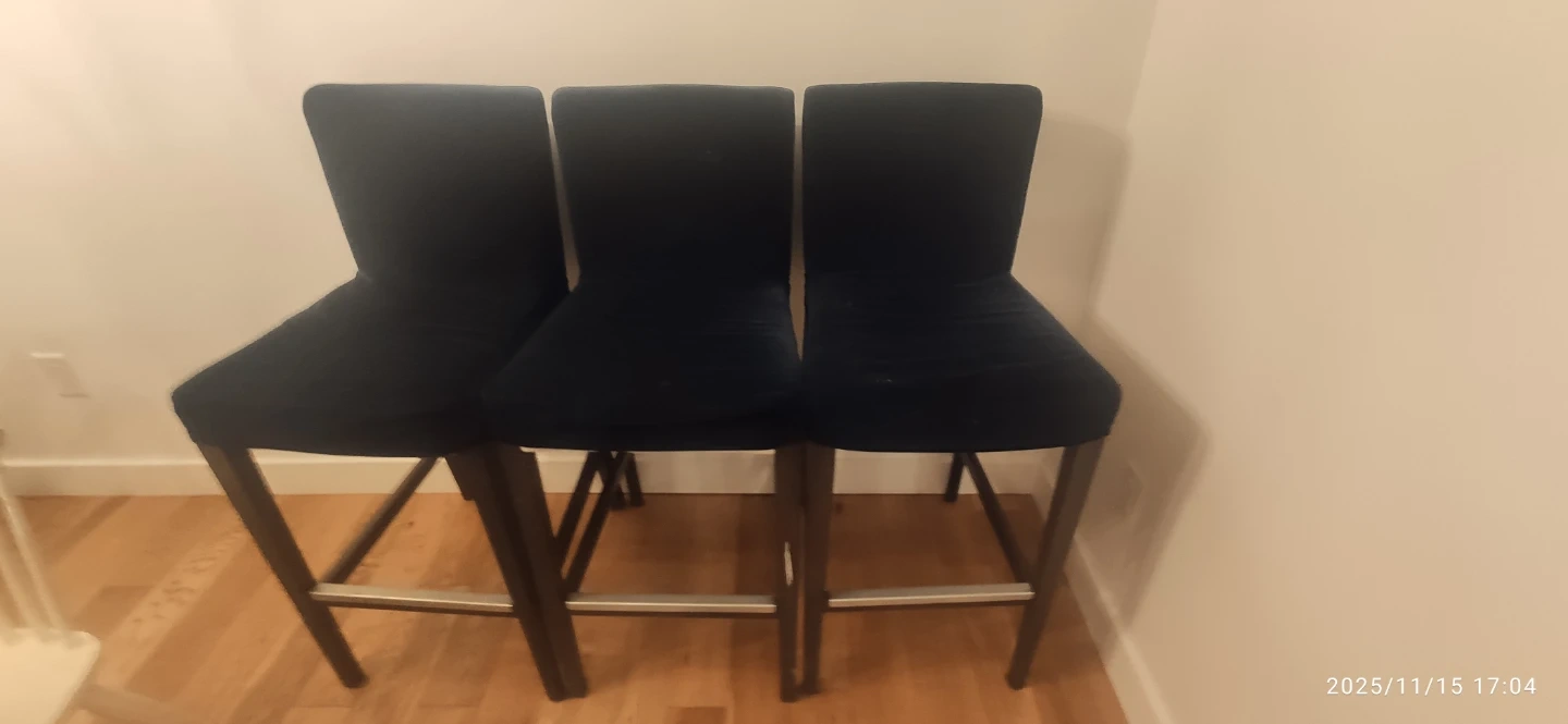 10Selling a set of three bar stools. They feature a sleek, modern design with a comfortable, cushioned seat and backrest. The stools are in great condition and would be a stylish addition to any kitchen or bar area. The colour is navy blue with velvet covers that can be put in the washing machine in washing machine. Pet free and smoke free house.
