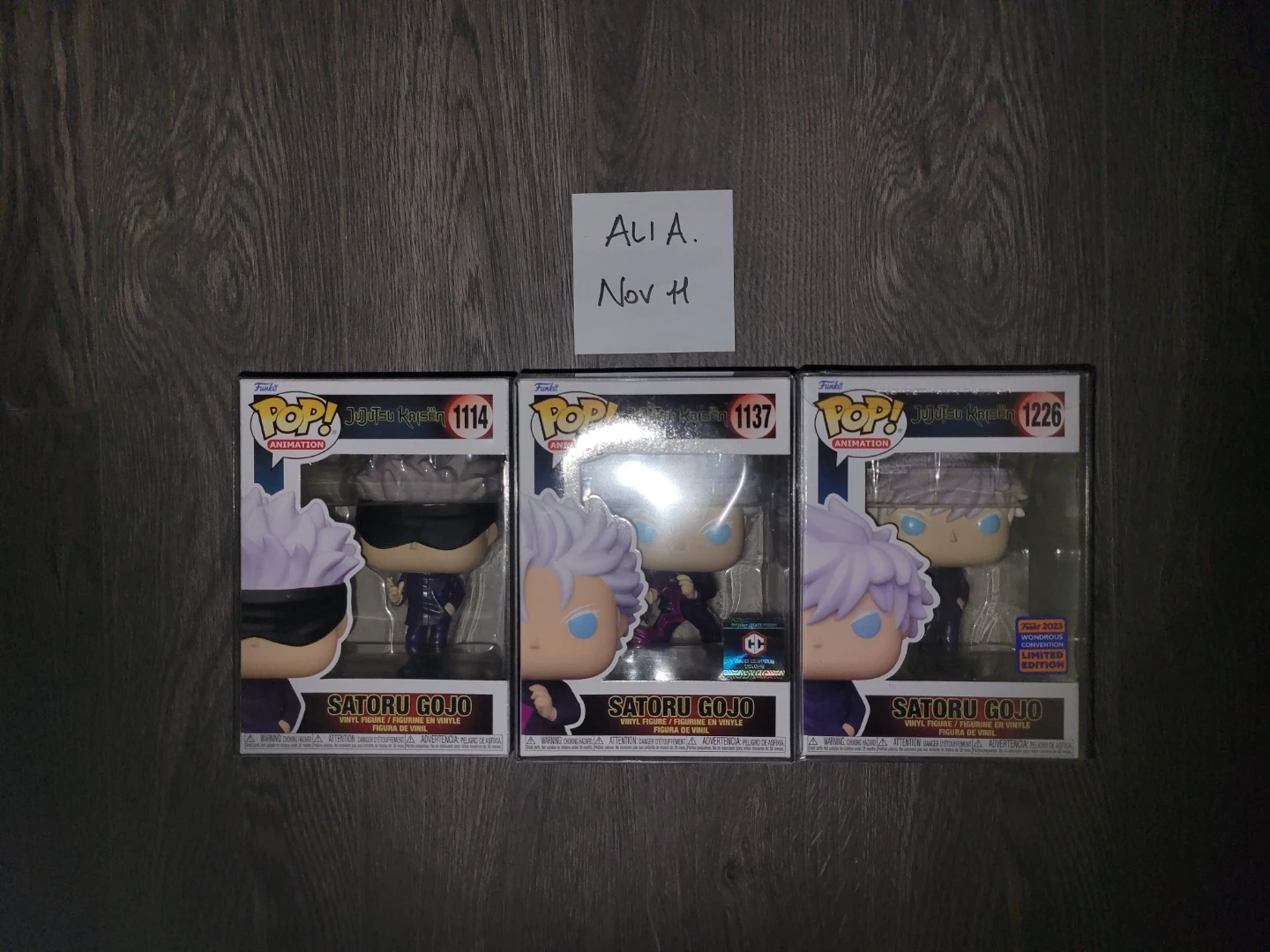 Selling three Funko POP! figures of Satoru Gojo from Jujutsu Kaisen. Includes figures #1114, #1137, and #1226. Figure #1226 is a 2023 WonderCon Limited Edition