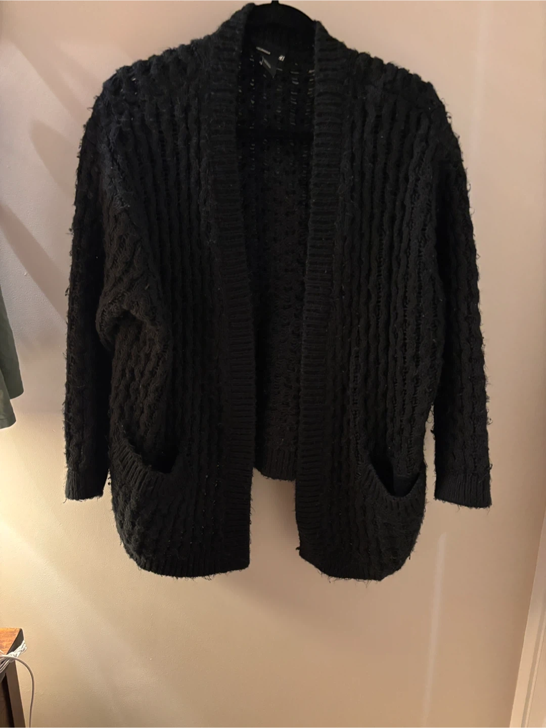 Selling a cozy black knit cardigan with pockets from H&M! It's a size small and has a basic knit design.
