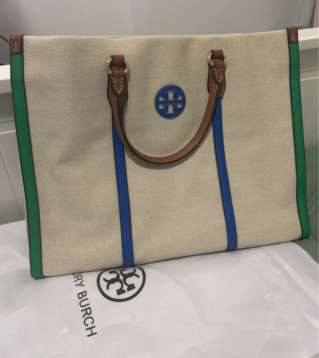 Selling a Tory Burch tote bag in great condition! It’s a cream canvas bag with green and blue leather accents! Incredibly spacious with two large pockets inside.