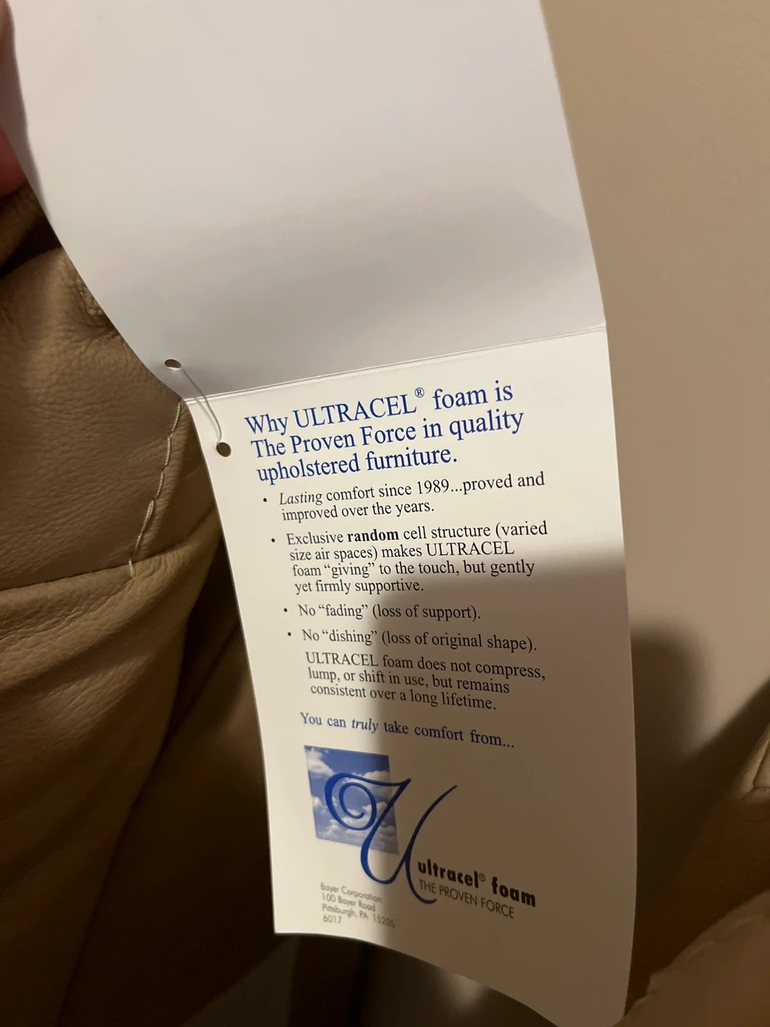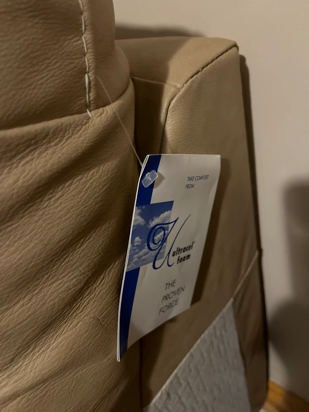 Selling an absolutely beautiful comfy NEW tan leather sectional couch that comes with a matching chase and ottoman! The couch features Ultracel foam, which provides lasting comfort and support. It's in excellent new with tag and ready to find a new home! SEE last PHOTO for dimensions. Serious inquiries need gone ASAP