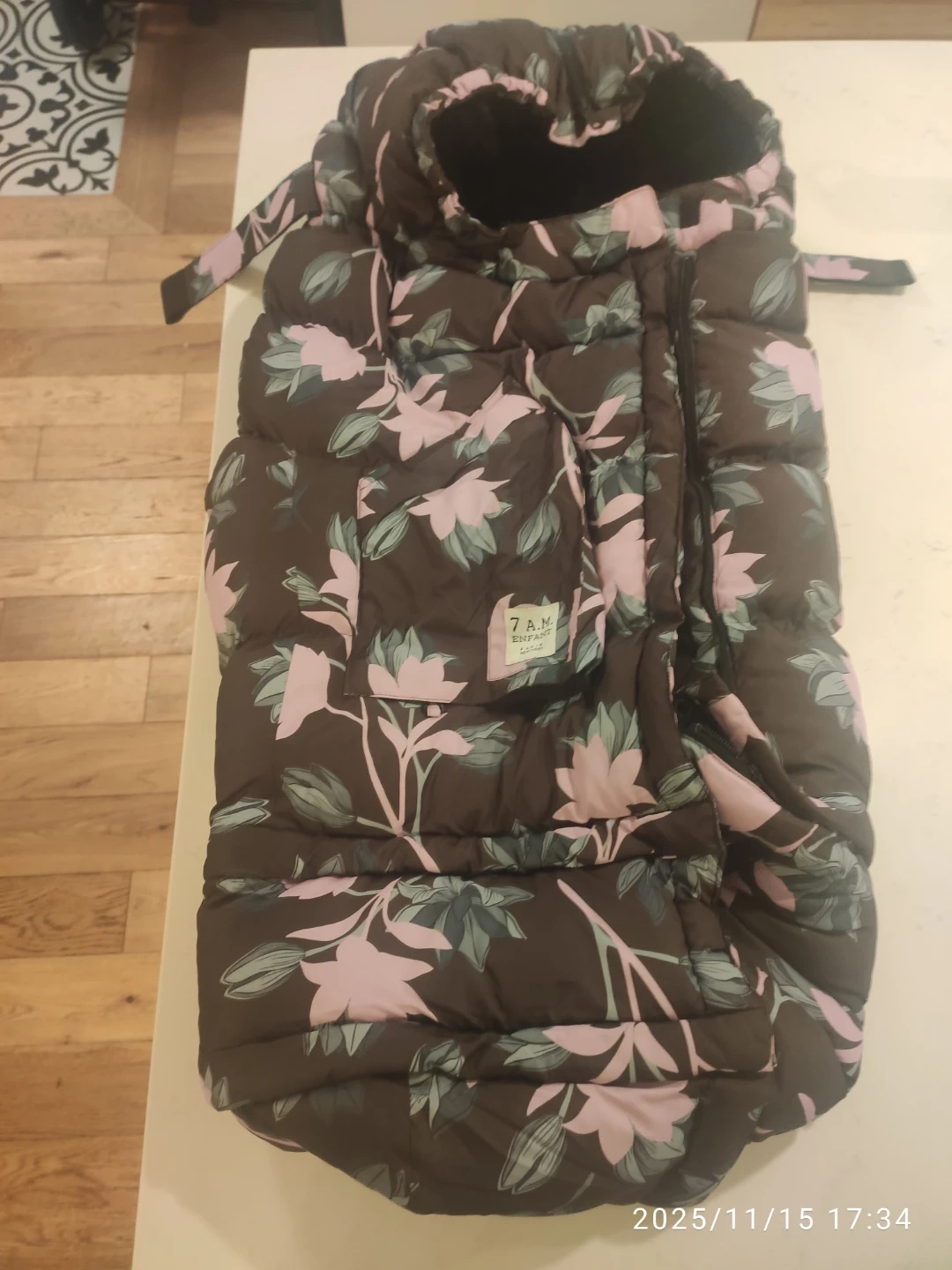 10Keep your little one cozy with this 7 A.M. Enfant stroller cocoon! It features a beautiful brown floral pattern. Perfect for those chilly Canadian days! Worn a few times last winter but baby outgrew it. Smoke and pet free home