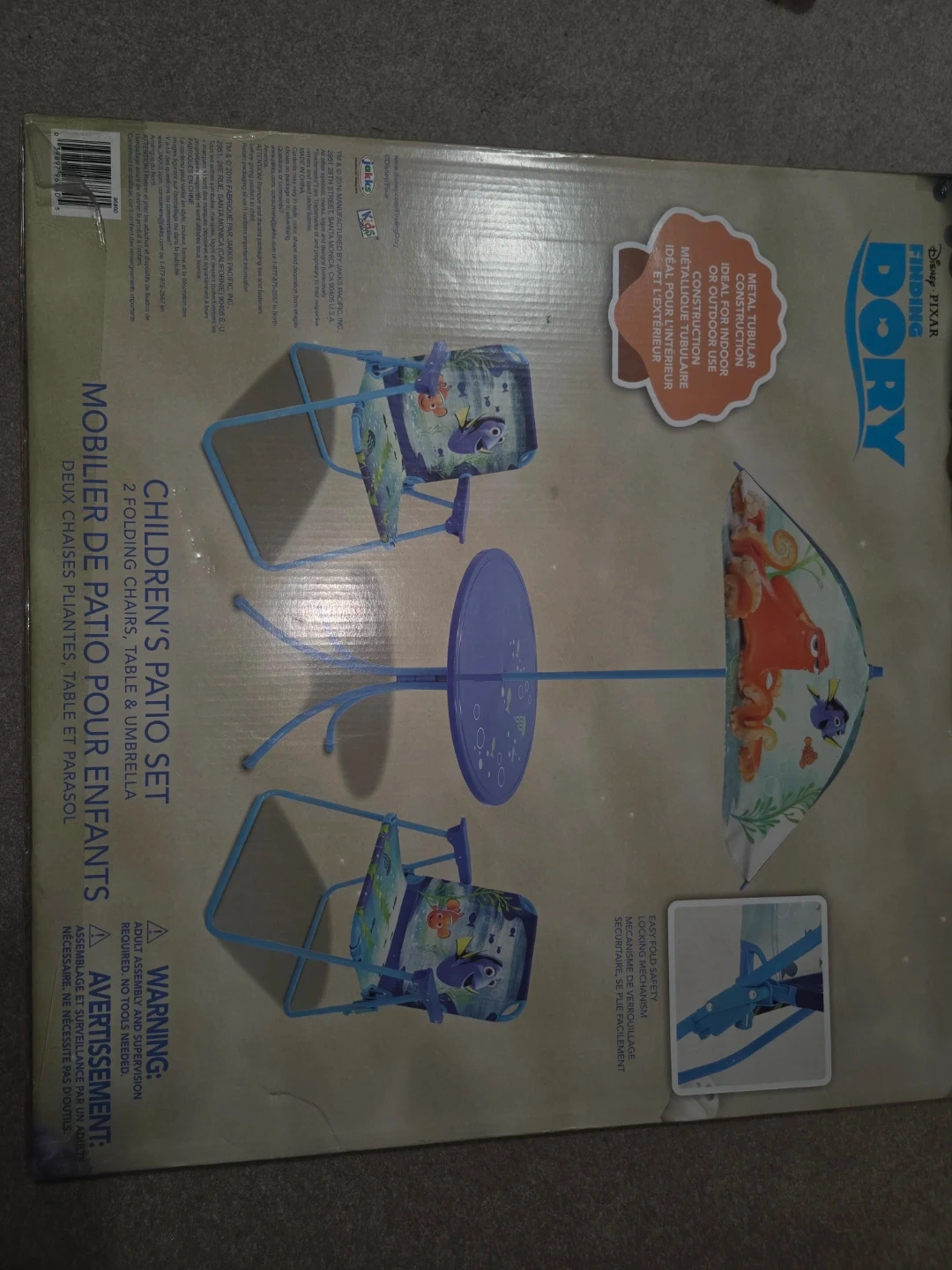 Get your little one ready for summer with this adorable Disney Finding Dory patio set! It includes two folding chairs, a table, and an umbrella, perfect for indoor or outdoor use. The set features a metal tubular construction for durability and easy folding for storage. Adult assembly and supervision are required. The box shows it's manufactured by Jakks Pacific.