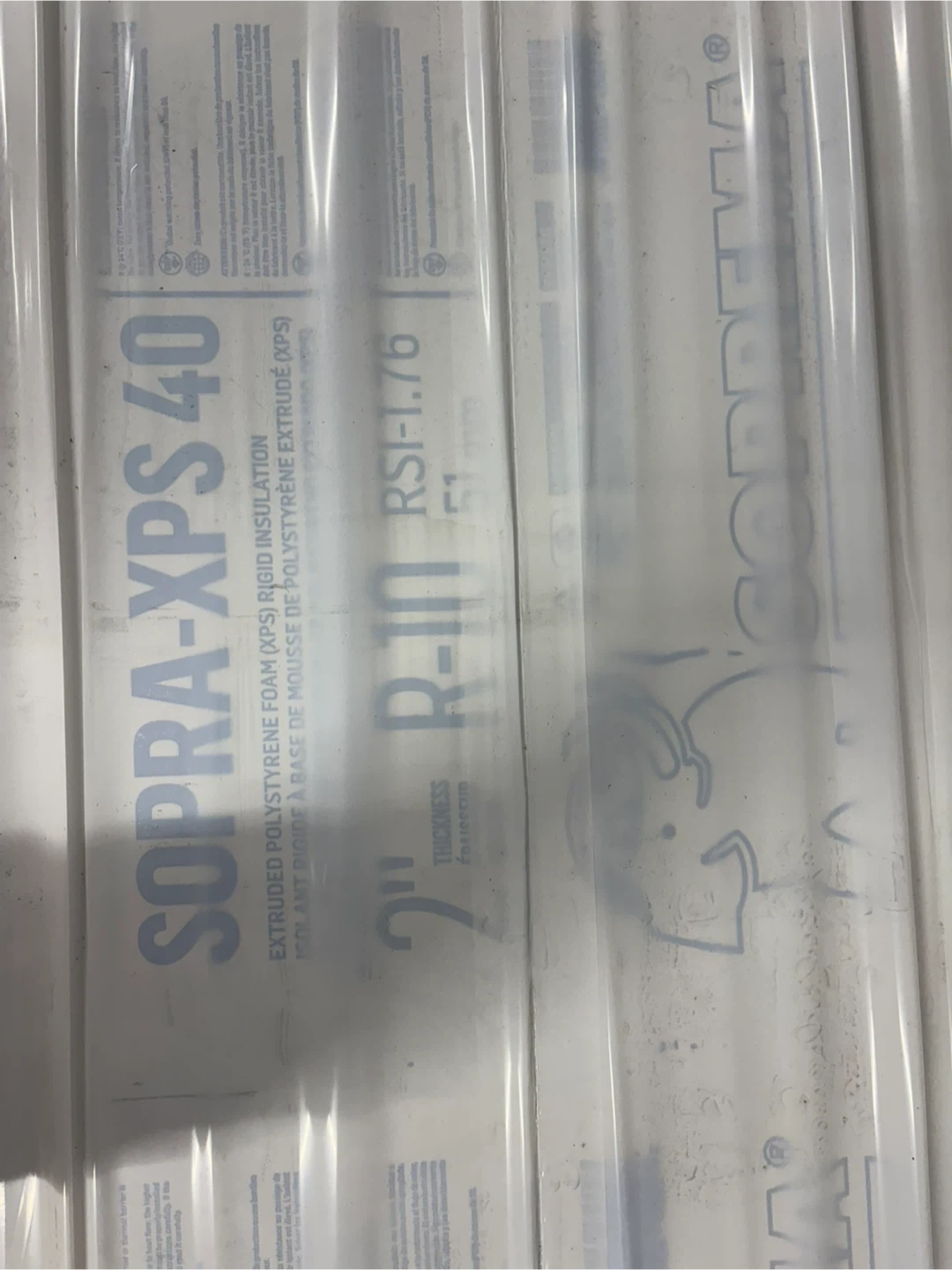 Selling Soprema XPS 40 rigid insulation boards. They are 2 inches thick 8x2 and are R-10 rated. Great for insulation projects!