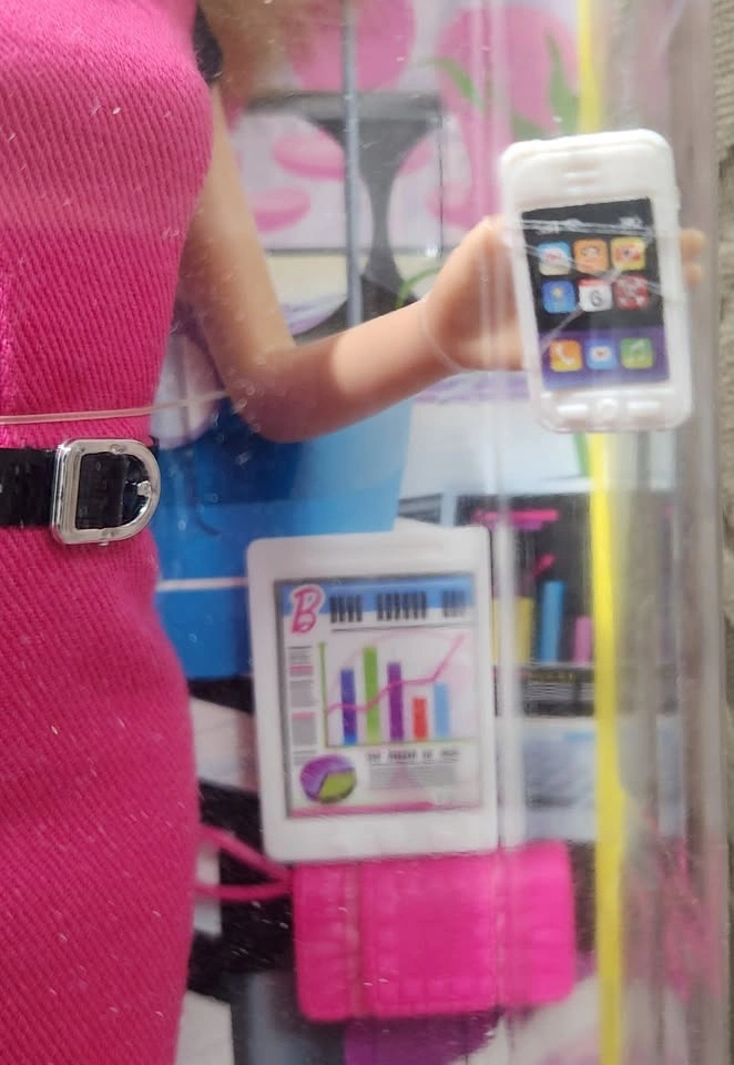 She is a Fashion Doll, looking fantastic and ready to go to the office, with cell phone in hand, as well as purse and tablet.
